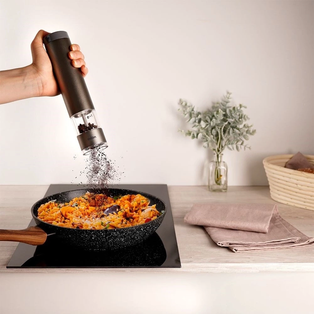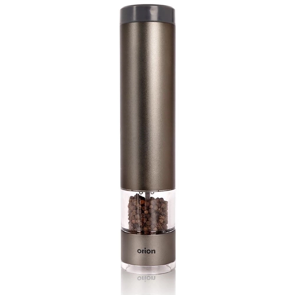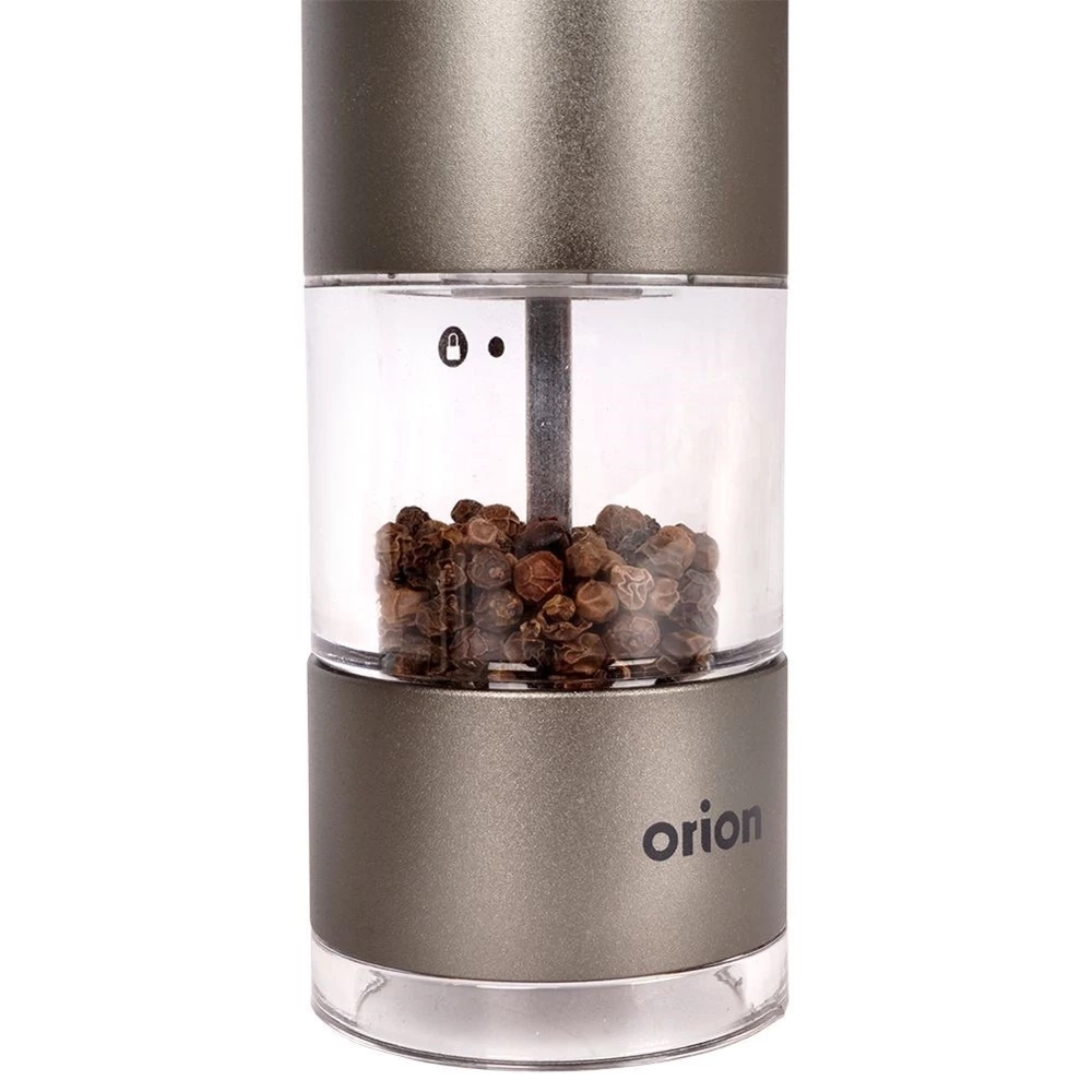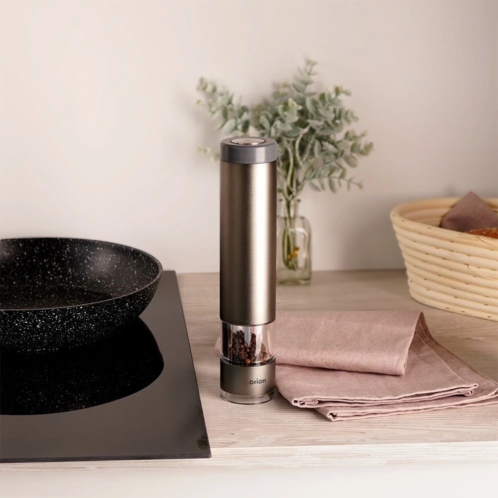 Młynek elektryczny o wysokości 22,5 cm i średnicy 4,5 cm. Wykonany solidnie z najwyższej jakości materiałów. Obudowa młynku wykonana z aluminium w kolorze grafitowym. Posiada stalowy przycisk uruchamiający mielenie oraz ceramiczny mechanizm mielący. Ceramiczny mechanizm mielący gwarantuje mielenie nawet najtwardszych ziaren. Młynek elektryczny sprawdzi się idealnie do mielenia soli, pieprzu lub innych przypraw. Zasilany 6x bateria 1,5V AAA. Młynek jest łatwy w obsłudze, mielenie uruchamia się za pomocą jednego przycisku, można bez problemu obsługiwać jedną ręką. Posiada możliwość regulacji mielonych ziaren, wyposażony również w blokadę, która uniemożliwi uruchomienie młynka przez dzieci w nieodpowiednim momencie. Młynek prezentuje się bardzo elegancko, odpowiedni kształt pozwoli na wygodne użytkowanie. Mielenie przypraw bezpośrednio przed dodaniem ich do dań pozwoli na wydobycie świeżego aromatu. Oryginalny produkt czeskiej marki Orion. Wyprodukowano zgodnie z europejskimi standardami.