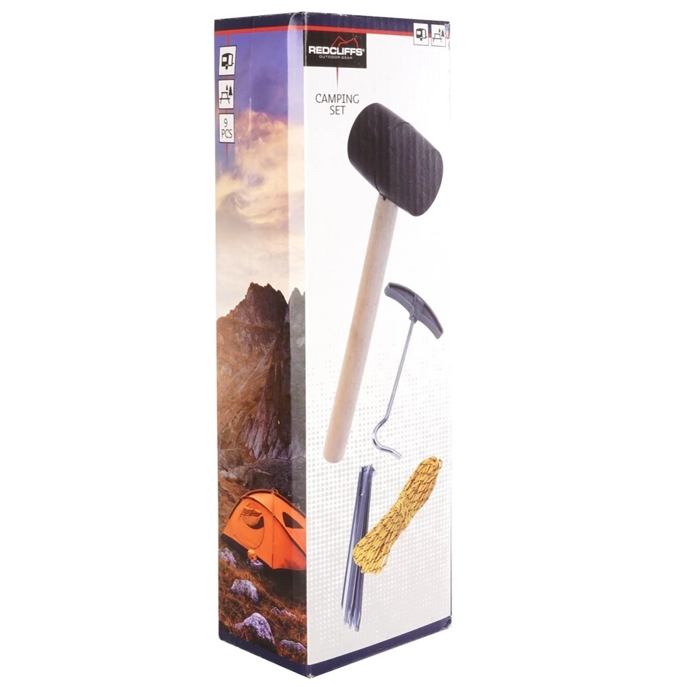 - Komplet kempingowy składający się z 9 elementów. W zestawie młotek, lina, śledzie oraz hak do wyciągania śledzi. Przydatny podczas nocowania w namiocie. Solidnie wykonany.