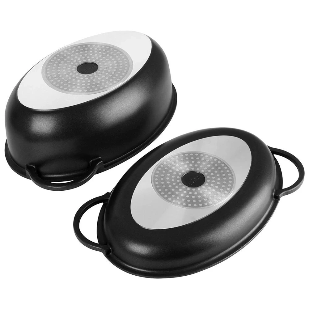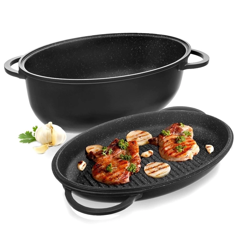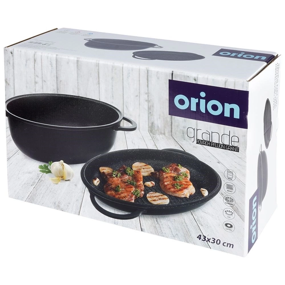 Owalna brytfanna z pokrywą w formie patelni grillowej, którą można używać jako osobne naczynie. W zestawie: 1x owalna brytfanna głęboka (wymiary zewnętrzne 43 x 27,5 x 13,5 cm, wymiary wewnętrzne 38 x 25 x 13 cm, pojemność 10 litrów), 1x patelnia grillowa (wymiary zewnętrzne 43 x 28 x 5,5 cm wymiary wewnętrzne 38 x 25 x 5 cm). Brytfanna jest niezwykle funkcjonalna. Patelnię grillową możemy wykorzystać również jako pokrywkę. Idealnie sprawdzi się do duszenia, pieczenia oraz gotowania potraw. Na patelni grillowej możemy smażyć potrawy. Pokrywka z funkcją patelni grillowej oraz osobnym indukcyjnym dnem doskonale sprawdza się do smażenia potraw. Zestaw ten jest niezwykle przydatny w każdej kuchni. Oryginalny produkt czeskiej marki Orion. Wyprodukowano zgodnie z europejskimi standardami.