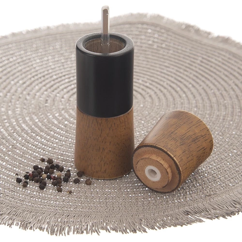 - Młynek ręczny do pieprzu, soli i innych przypraw. Wykonany z drewna kauczukowego oraz tworzywa. Posiada ceramiczny mechanizm mielący wraz z regulacją grubości mielenia.
