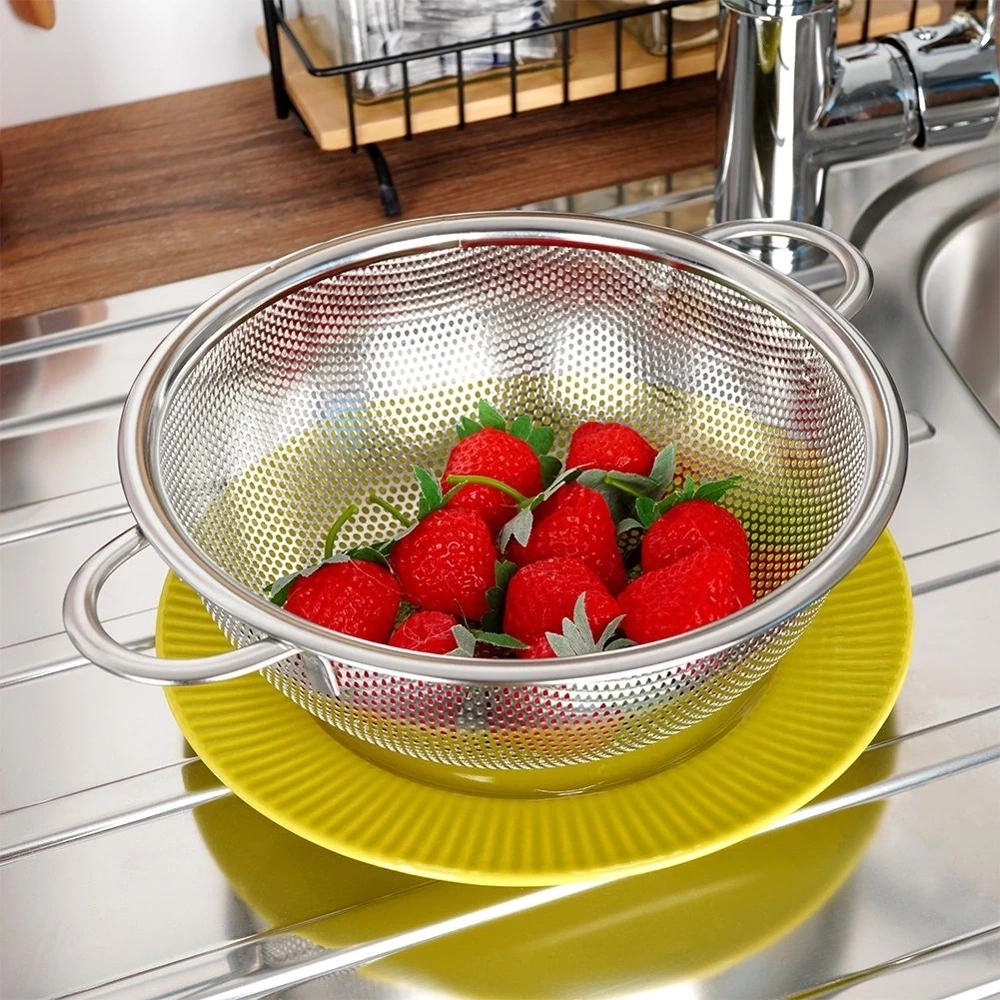 - Uniwersalne sitko kuchenne w formie miski. Wykonane ze stali nierdzewnej. Posiada dwa uchwyty oraz nóżki, które zapewnią stabilizację. Sprawdzi się do odcedzania, mycia i płukania produktów.