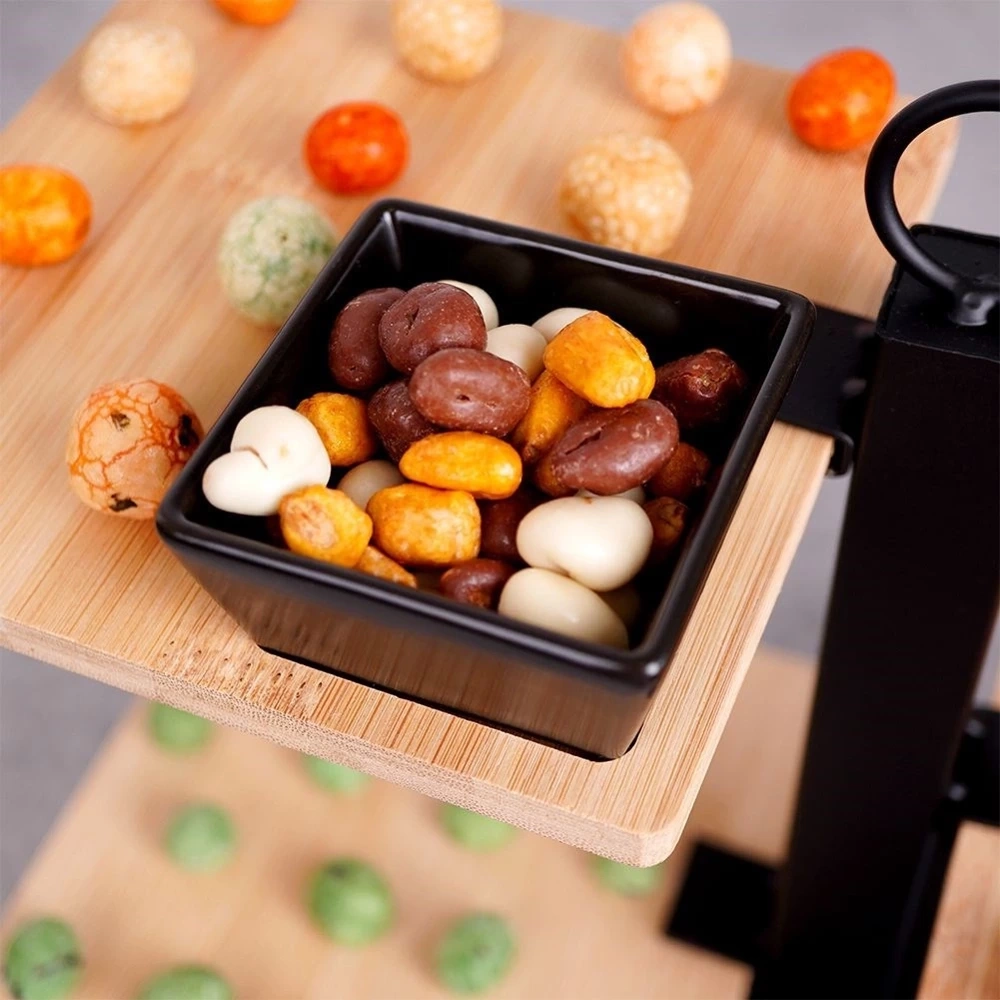- Piętrowa patera na wędlinę, sery, ciastka, owoce, przystawki, przekąski. Posiada 3 poziomy z 3 tacami wykonanymi z drewna bambusowego, konstrukcja metalowa. W zestawie miseczka.