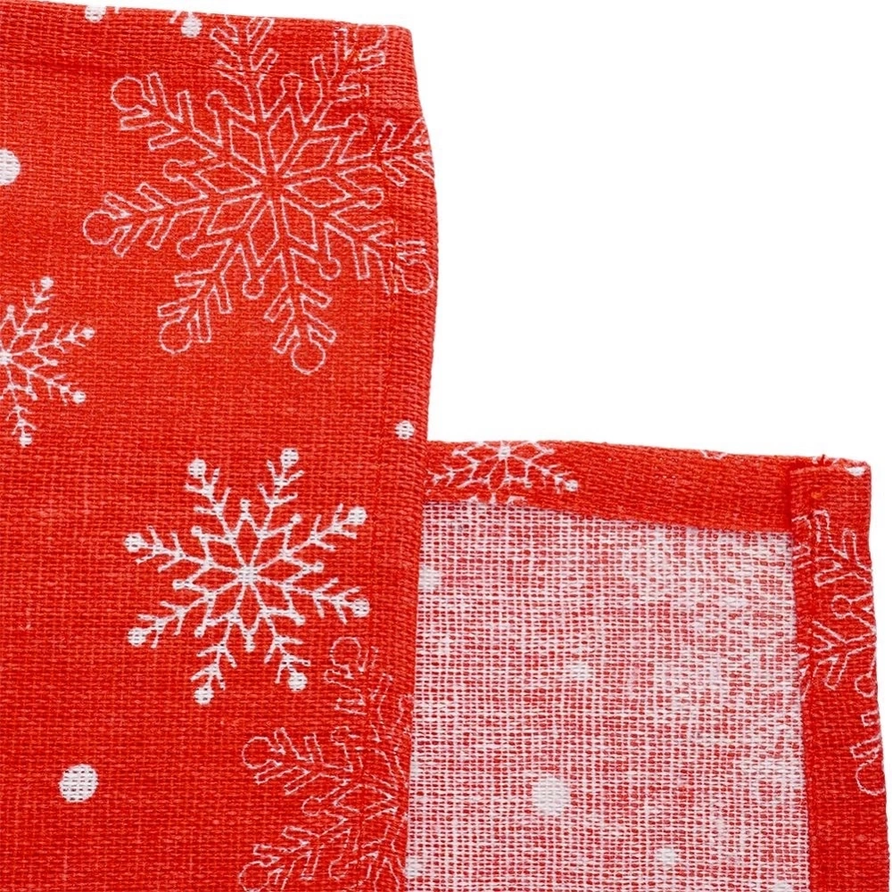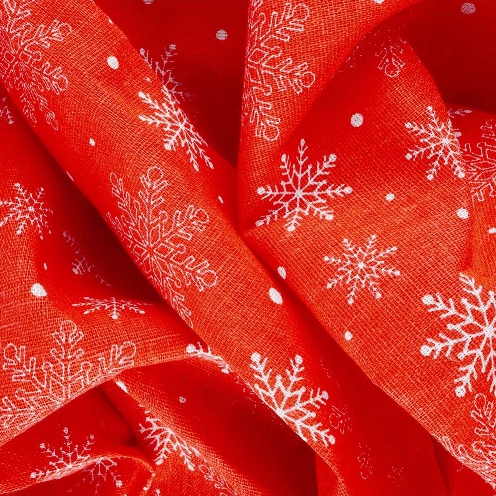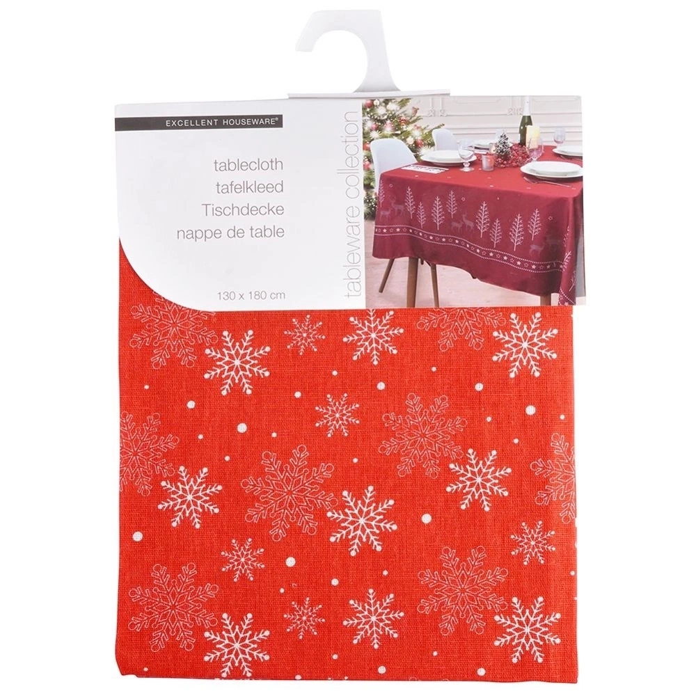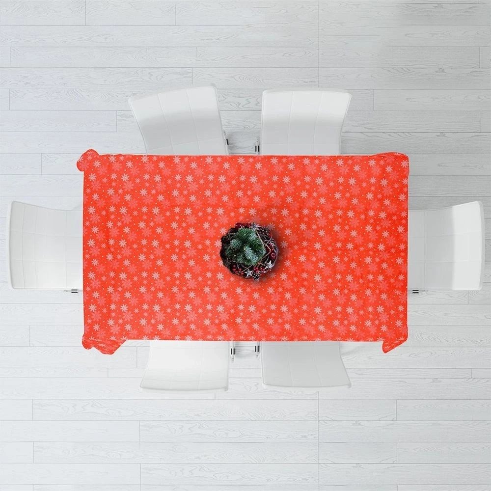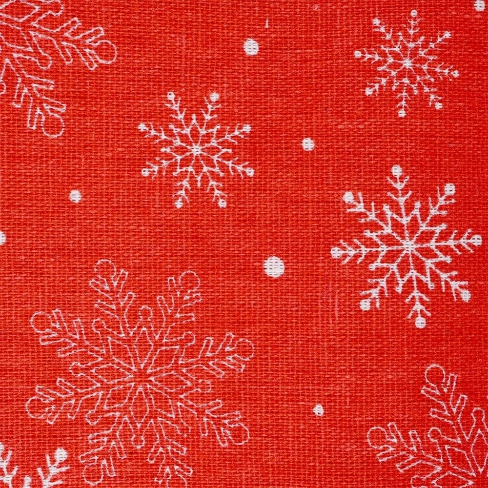- WYTRZYMAŁY - Obrus wykonany w 80% z poliestru a w 20% z bawełny. Obrus posiada czerwony kolor i świąteczny nadruk na którym znajdują się płatki śniegu. Wygląd obrusu od razu przywodzi na myśl święta.