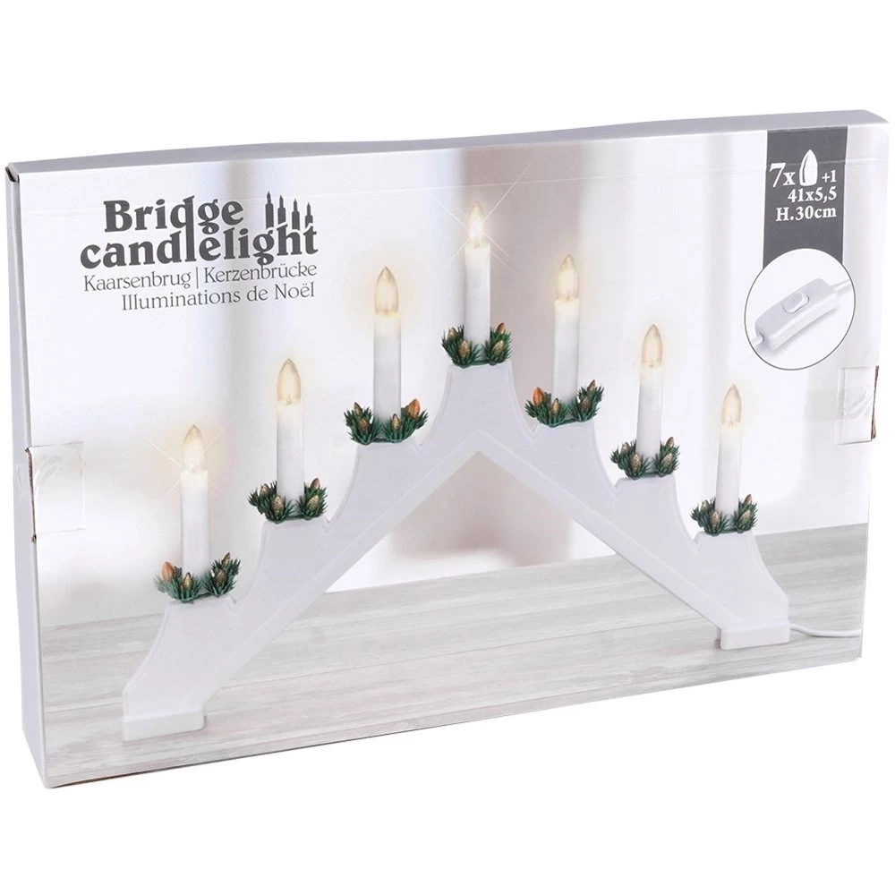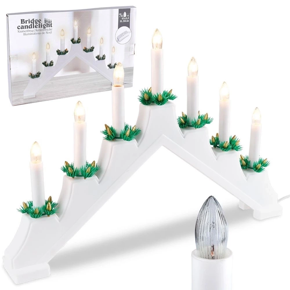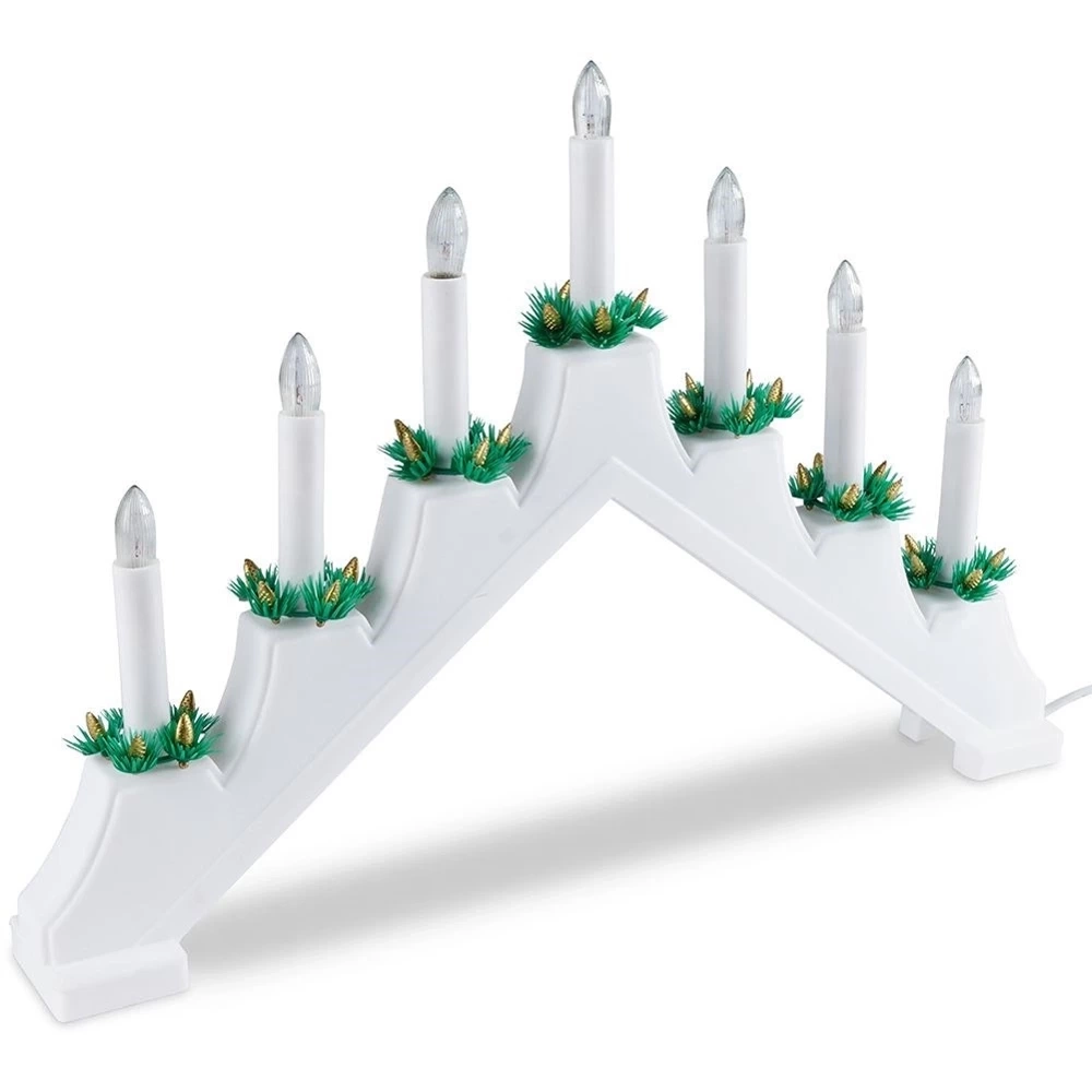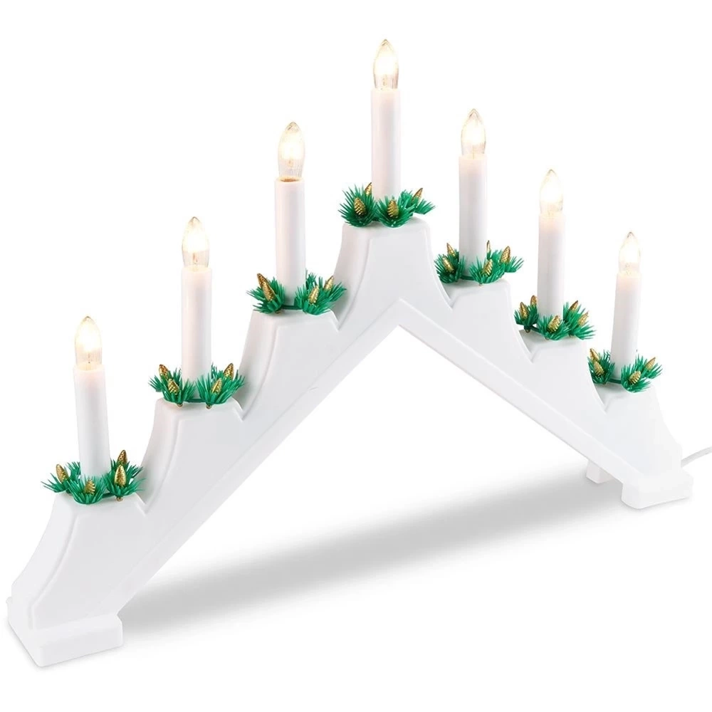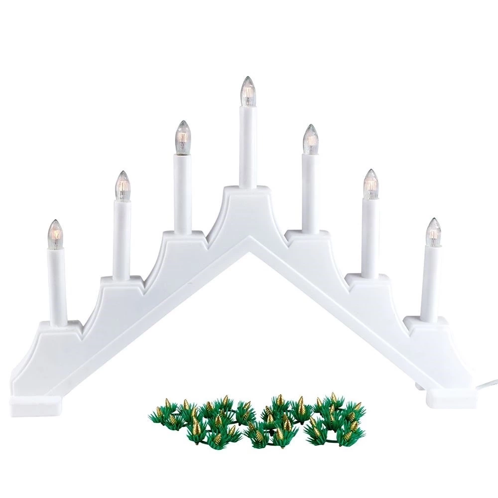 - Świecznik adwentowy z siedmioma świecami. Zasilany sieciowo. Podstawa w kolorze białym. Posiada włącznik i 1,5 m kabel. Do postawienia na kominku lub oknie.