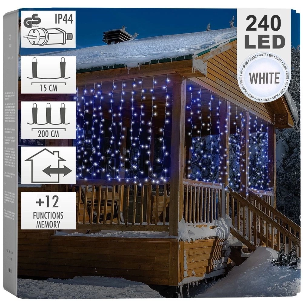 - Kurtyna świetlna, świecąca 240 diodami LED. 12 trybów świetlnych z funkcją pamięci. Świetnie prezentuje się zarówno wewnątrz jak i na zewnątrz domu.