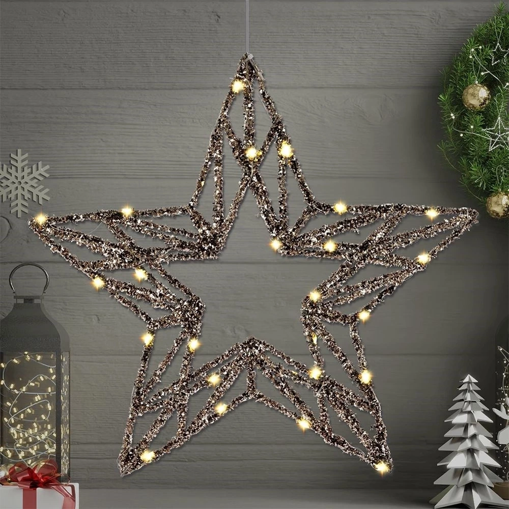 Świecąca gwiazda z lampkami LED. Do zastosowania wewnątrz pomieszczeń. Gwiazda prezentuje się bardzo efektownie jest wyjątkowym elementem dekoracyjnym w okresie świąt Bożego Narodzenia. Możemy ustawić ją na komodzie, stoliku bądź szafce lub zawiesić w dowolnym miejscu. Nada oryginalnego charakteru każdemu wnętrzu. Wyprodukowano zgodnie z europejskimi standardami.