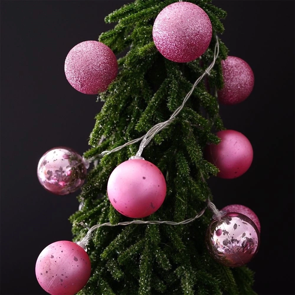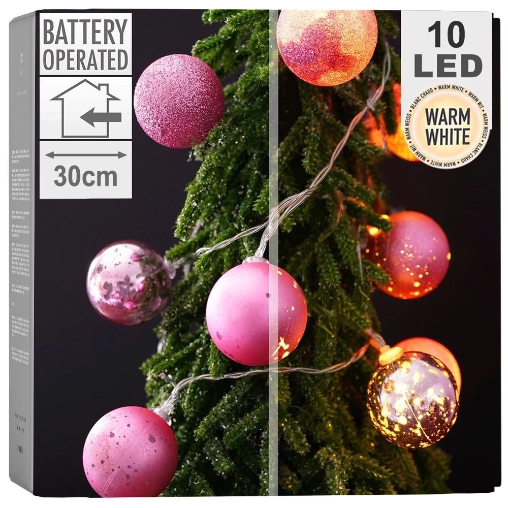 - Świecące bombki w kolorze różowym. W zestawie bombki matowe, brokatowe oraz błyszczące. Zasilane na baterie, posiadają 10 LED. do zastosowania wewnątrz pomieszczeń.