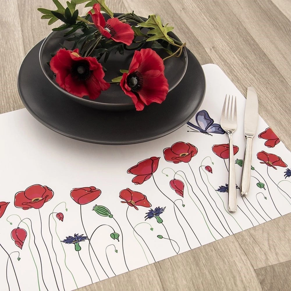 - Prostokątna podkładka kuchenna wykonana z tworzywa w białym kolorze z motywem maków. Stanowi piękne tło dla zastawy stołowej i sztućców.