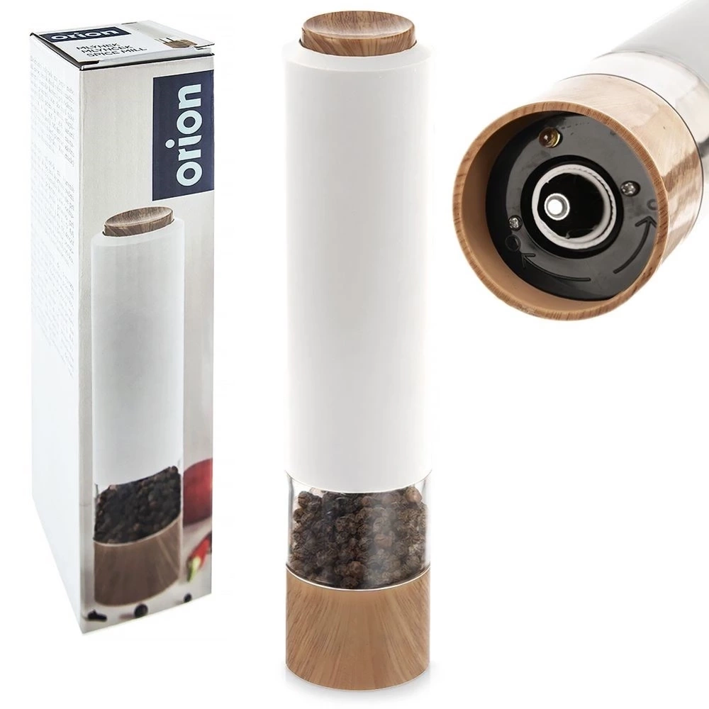 Młynek elektryczny do mielenia soli, pieprzu oraz innych przypraw. Wykonany solidnie z najwyższej jakości materiałów. Mielenie przypraw bezpośrednio przed dodaniem ich do dań pozwoli na wydobycie świeżego aromatu. Młynek prezentuje się bardzo efektownie. Jest również świetnym pomysłem na prezent dla bliskich. Oryginalny produkt czeskiej marki Orion. Wyprodukowano zgodnie z europejskimi standardami.