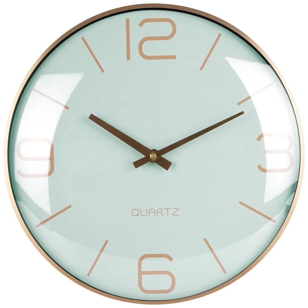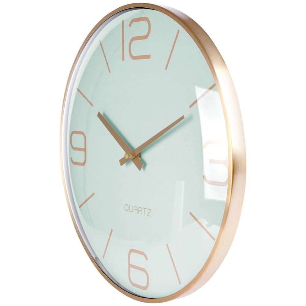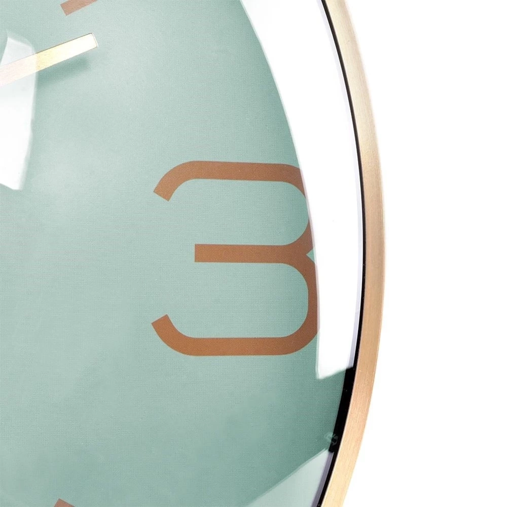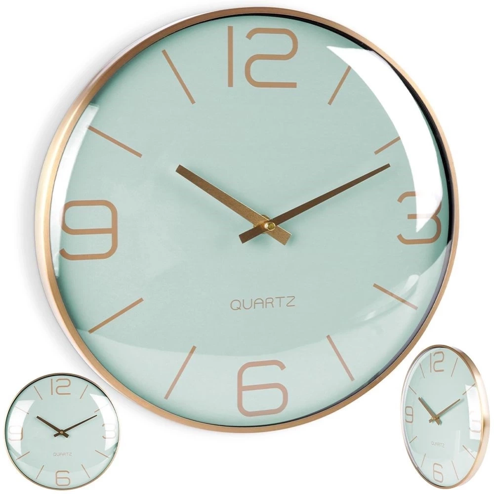 - Wyjątkowy zegar ścienny o średnicy 30 cm. Utrzymany w klasycznym stylu. Posiada wyraźne liczby oraz wskazówki w złotym kolorze a tarcza w kolorze miętowym.