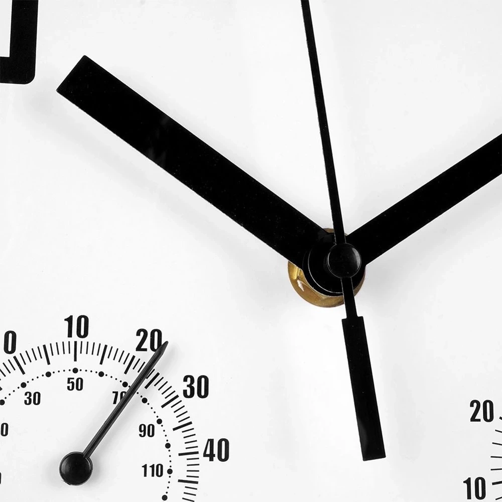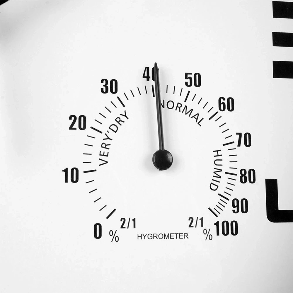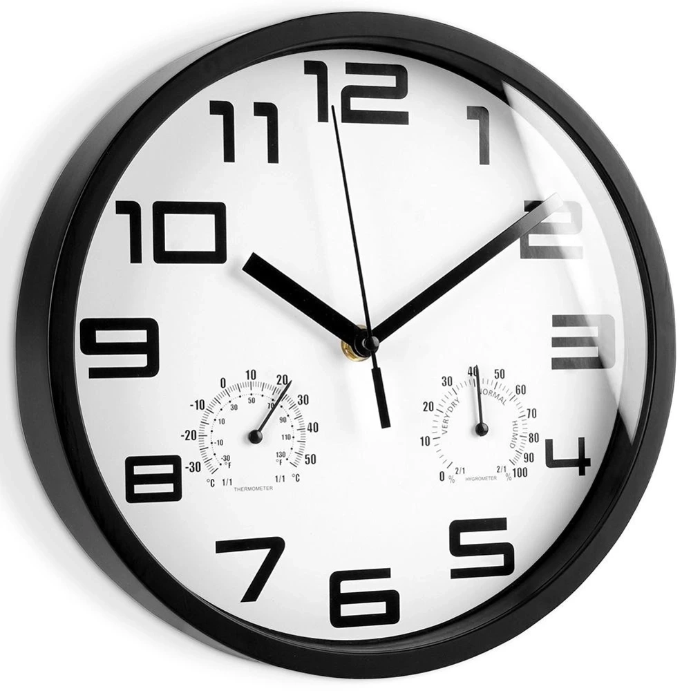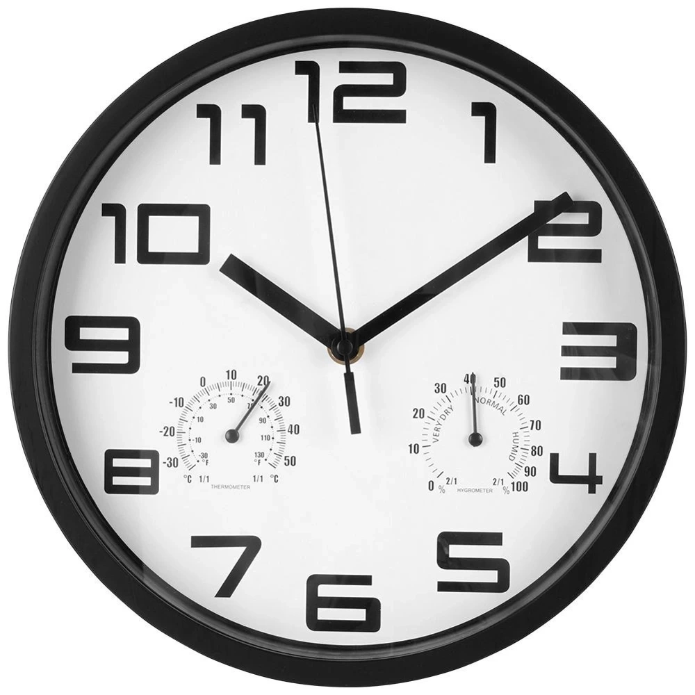 - Wyjątkowy zegar ścienny o średnicy 25 cm z termometrem i higrometrem. Utrzymany w klasycznym stylu. Posiada wyraźne liczby oraz wskazówki.