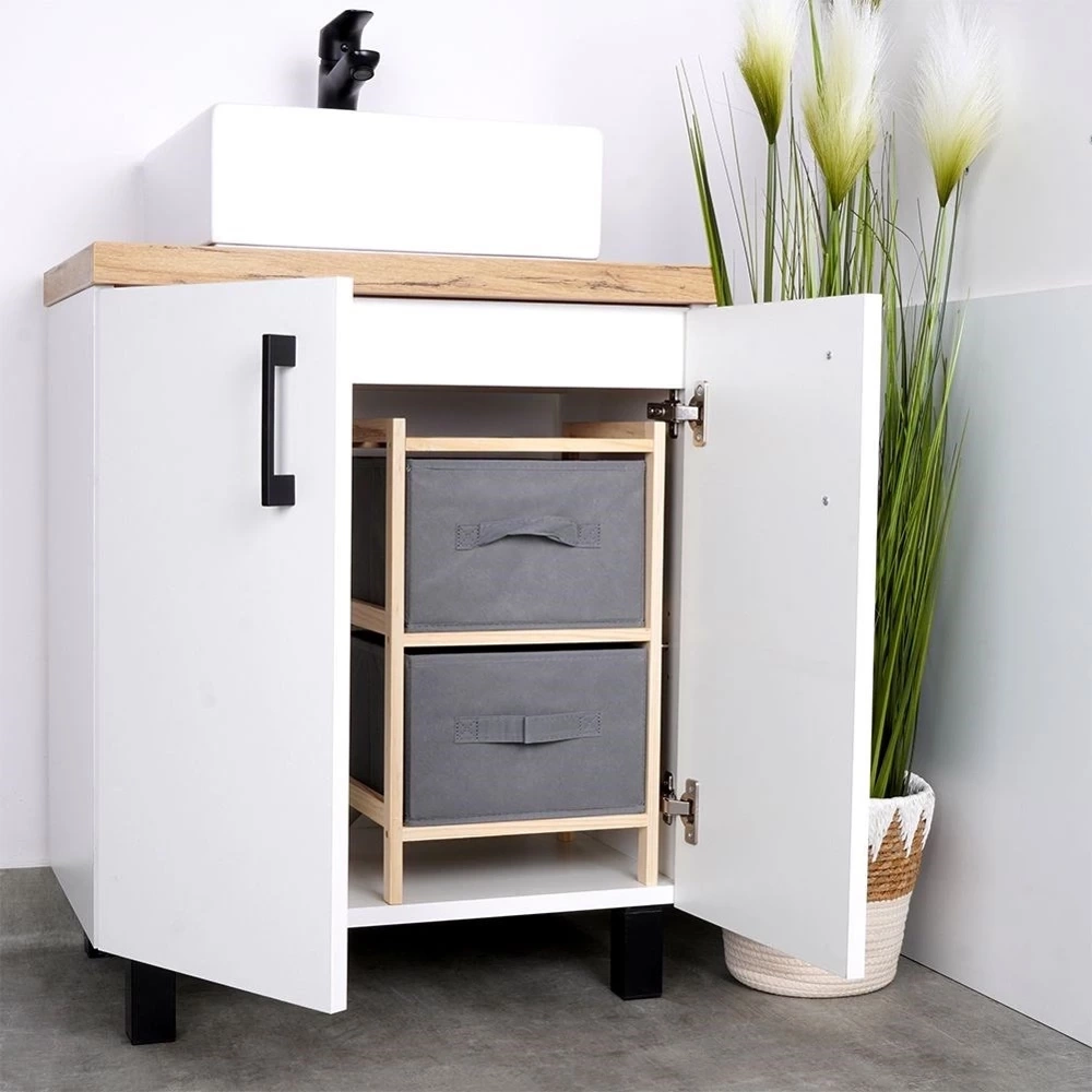 Szafka z dwoma szufladami w formie wygodnych pojemników. Posiada uniwersalne zastosowanie a korzystanie z pojemników jest bardzo praktyczne. Szafka swoim wyglądem nawiązuje do modnego stylu skandynawskiego. Jej wygląd sprawia, że świetnie nadaje się do aranżacji każdego pomieszczenia w domu, w tym również łazienki. Dzięki niej uzyskamy dodatkowe miejsce do przechowywania różnych rzeczy. Wyprodukowano zgodnie z europejskimi standardami.