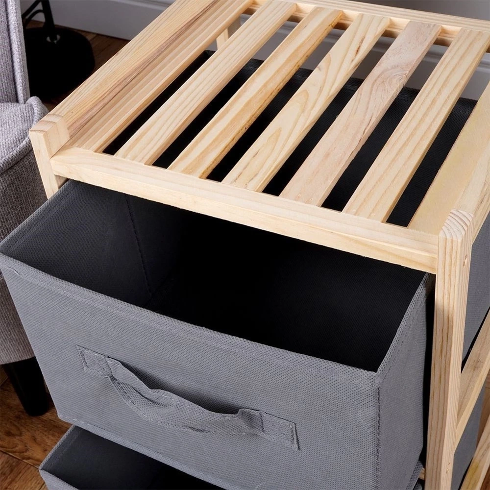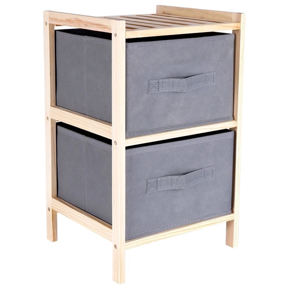 - Szafka z dwoma szufladami w formie praktycznych pojemników. Konstrukcja szafki wykonana z drewna sosnowego a pojemniki z materiału w kolorze szarym.