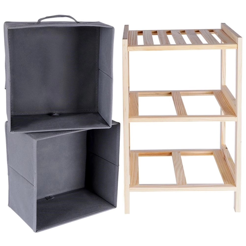 - DREWNIANA - Konstrukcja szafki została wykonana z naturalnego drewna sosnowego. Pojemniki są wykonane z usztywnianego materiału w kolorze szarym.