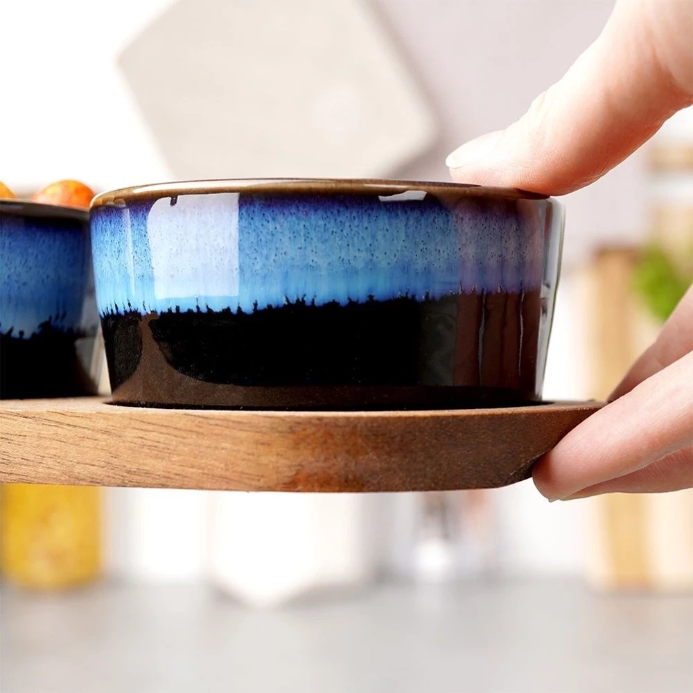 - CERAMICZNE - Zestaw trzech miseczek wykonanych z ceramiki w granatowo czarnym kolorze, usadowionych na tacy z drewna akacjowego. Połączenie minimalizmu z nowoczesnym designem. Wymiar zewnętrzny wynosi 29,5 x 10 x 5 cm. Miseczki mają wymiar 9 x 4 cm i pojemność 130 ml każda.