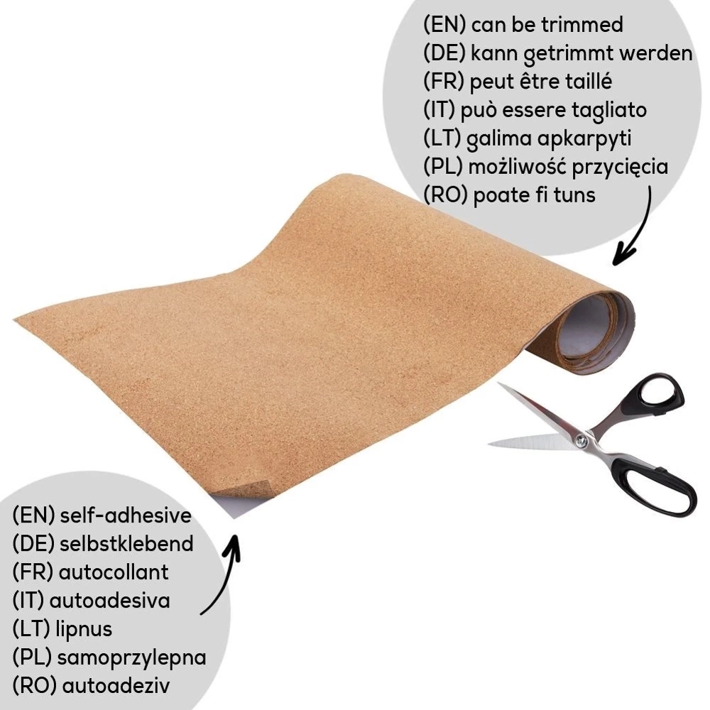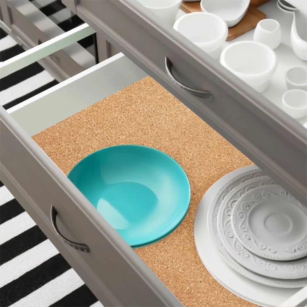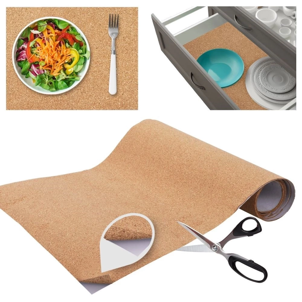 - Mata samoprzylepna do szuflad i szafek wykonana z korka. Podkładka może być przycinana, dzięki czemu uzyskamy dowolne rozmiary oraz kształty.
