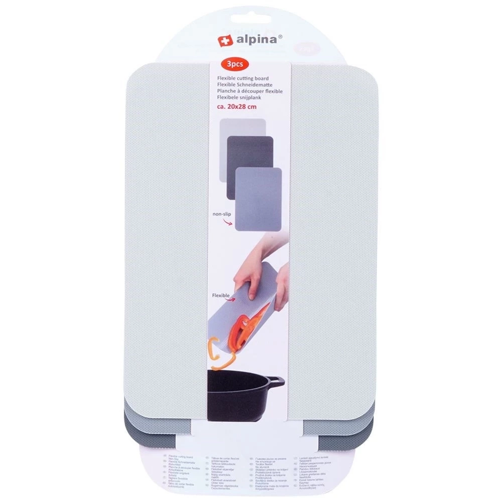 Zestaw trzech desek w różnych odcieniach szarości. Deski są w formie elastycznej podkładki, którą można w łatwy sposób wygiąć, co ułatwi przerzucanie pokrojonych produktów. Trzy kolory w zestawie pozwolą na przypisanie każdemu z nich odpowiedniego przeznaczenia np. deska do mięsa, ryb czy warzyw. Dzięki desce utrzymamy blat w czystości i ochronimy go przed zarysowaniami. Deska dzięki swojej funkcjonalności będzie często wykorzystywana w kuchni. Oryginalny produkt holenderskiej marki Alpina. Wyprodukowano zgodnie z europejskimi standardami.