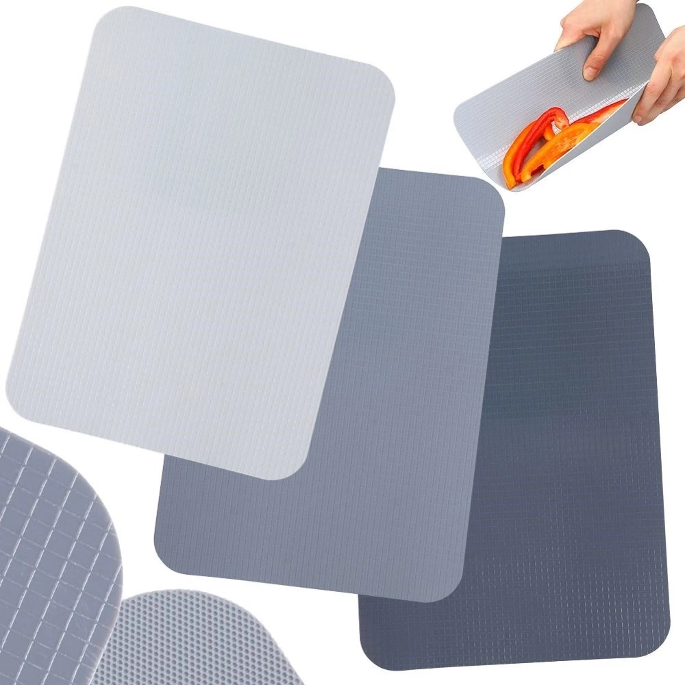 - PRAKTYCZNE - Zestaw trzech desek do krojenia produktów. Każda z desek ma wymiary 28 x 20 cm. Deska jest w formie maty i ma grubość 1 mm.