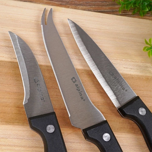 Zestaw trzech noży kuchennych. W zestawie: 1x nóż do obierania (długość noża 18,5 cm, długość ostrza noża 7,5 cm) 1x nóż uniwersalny ( długość noża 20 cm długość ostrza noża 9 cm), 1x nóż do sera (długość noża 22,6 cm, długość ostrza noża 11,5 cm). Noże są niezwykle wygodne w użytkowaniu, dzięki odpowiednio wyprofilowanej rączce. Noże będą przydatne podczas różnych prac w kuchni. Oryginalny produkt holenderskiej marki Alpina. Wyprodukowano zgodnie z europejskimi standardami.
