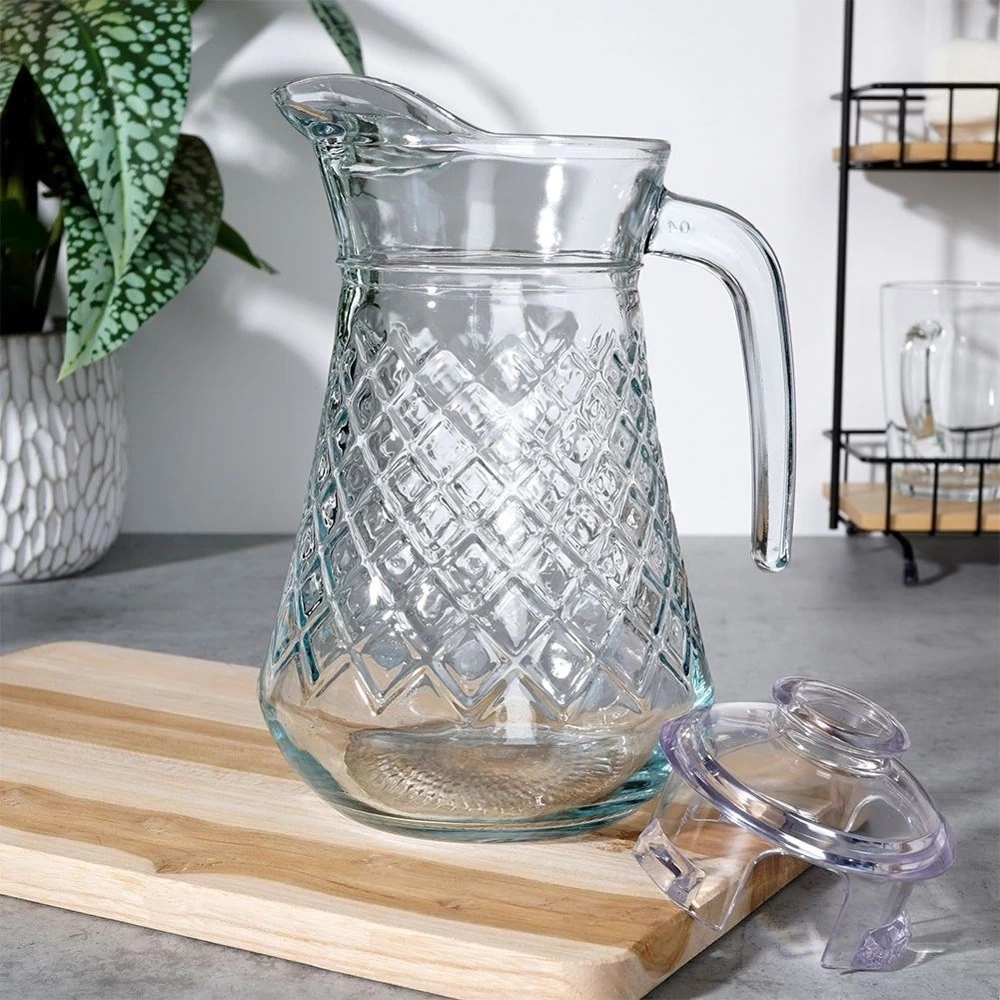 - SZKLANY - Dzbanek do napojów z pokrywką wykonany z wysokiej jakości grubego szkła w przezroczystym kolorze. Dzbanek posiada wytłaczany wzór. Dzbanek używając z pokrywką ma pojemność 1,3 litra oraz wymiary: 15 x 13,5 x 21 cm. Maksymalna pojemność dzbanka bez pokrywki wynosi 1,4 litra.