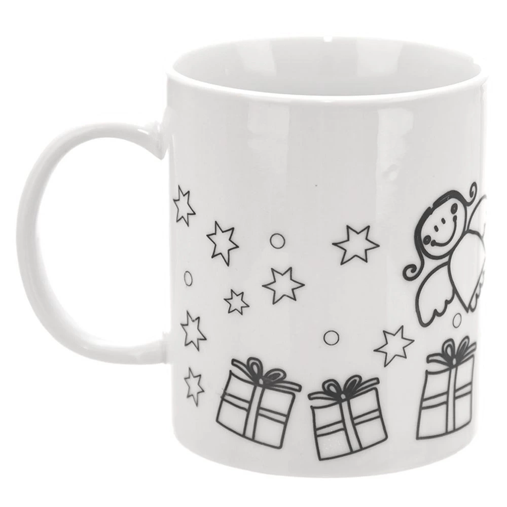 - Kubek do samodzielnego malowania farbkami. W zestawie pędzelek oraz 6 farbek. Kubek wykonany z porcelany w białym kolorze. Na kubku znajduje się świąteczny motyw z choinką.