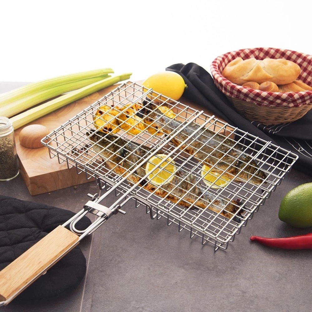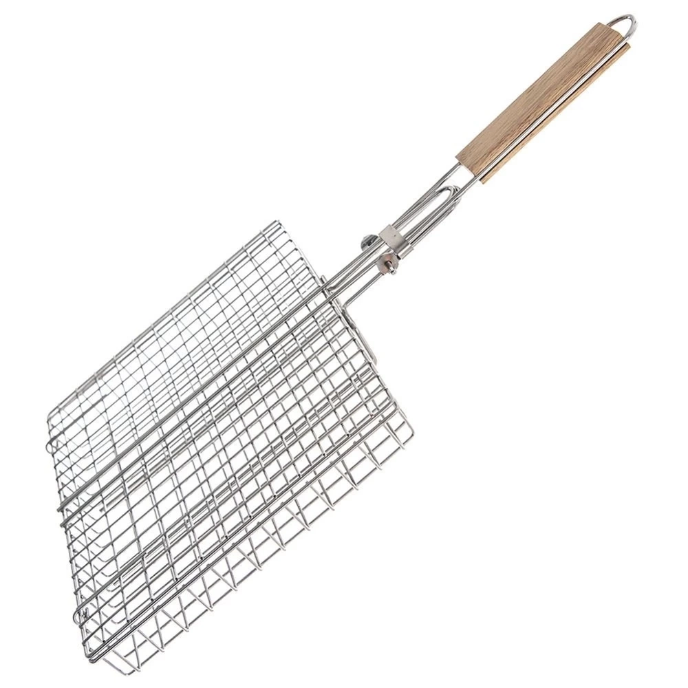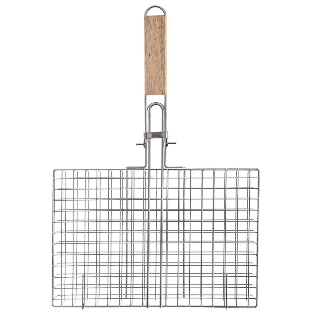 - Zamykany, uniwersalny koszyk do przygotowywania potraw na grillu. Dzięki niemu obracanie potraw jest niezwykle proste. Wykonany z metalu chromowanego z drewnianym uchwytem.