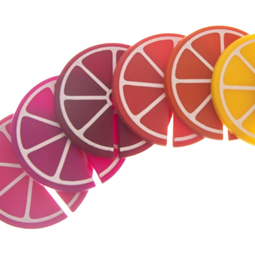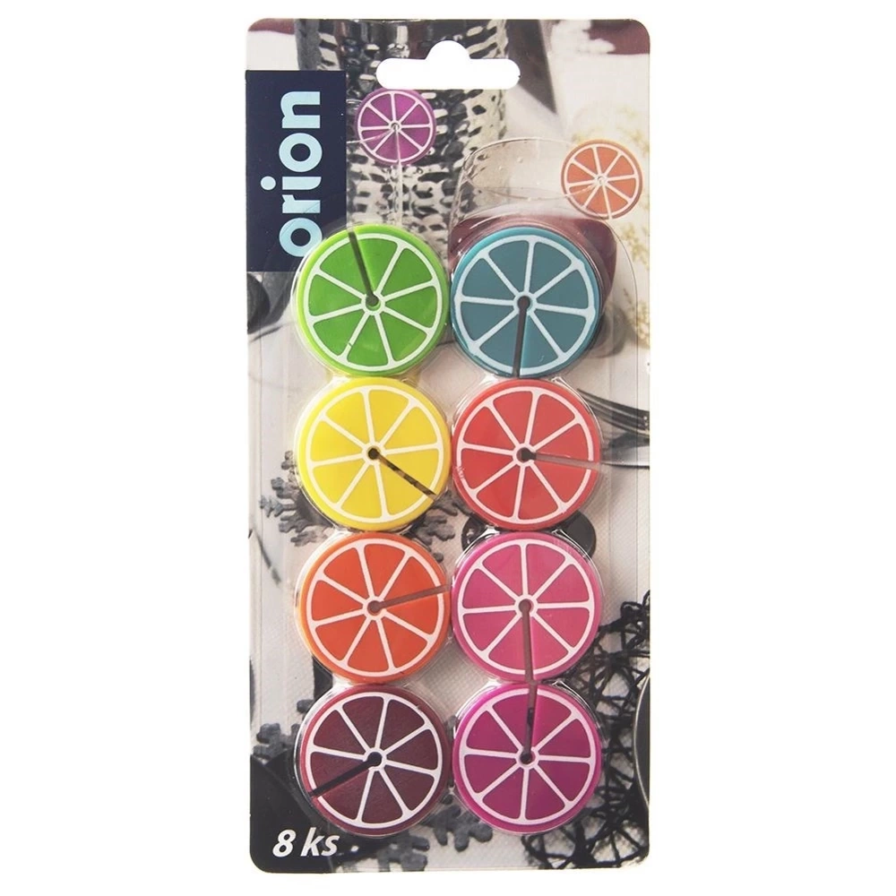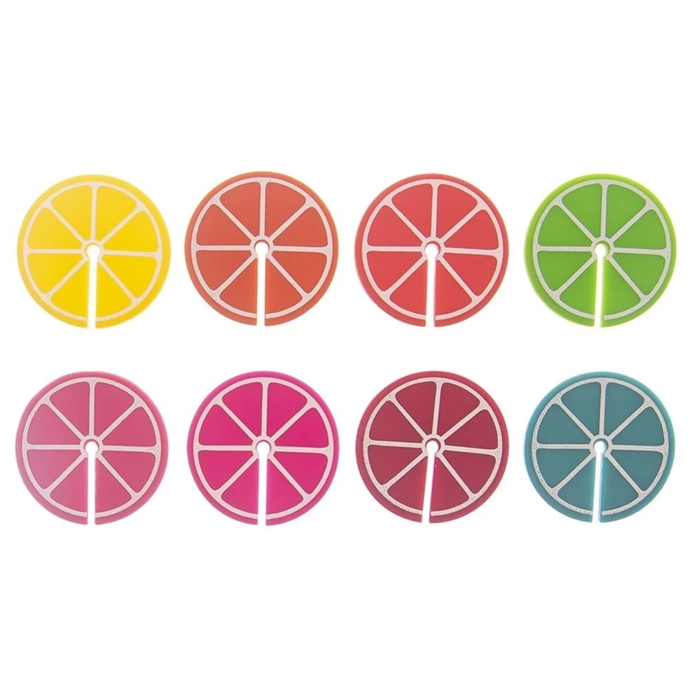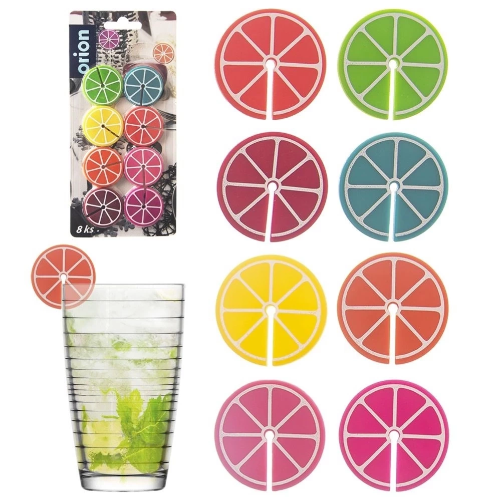- PRZYDATNE - Zestaw 8 sztuk kolorowych znaczników na szklanki. Znaczniki są w kształcie plasterków cytrusów o średnicy 3,7 cm. Świetny sposób na oznaczenie szklanek i kieliszków.