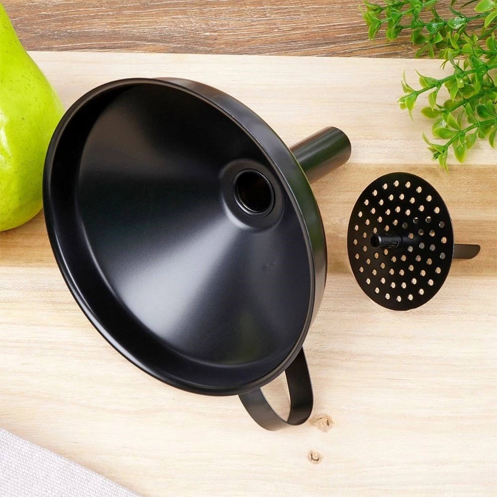 - Praktyczny lejek do przelewania wyposażony w sitko. Wykonany z wysokiej jakości stali nierdzewnej w czarnym kolorze. Idealny do przelewania napojów np. soków, nalewek, wina.