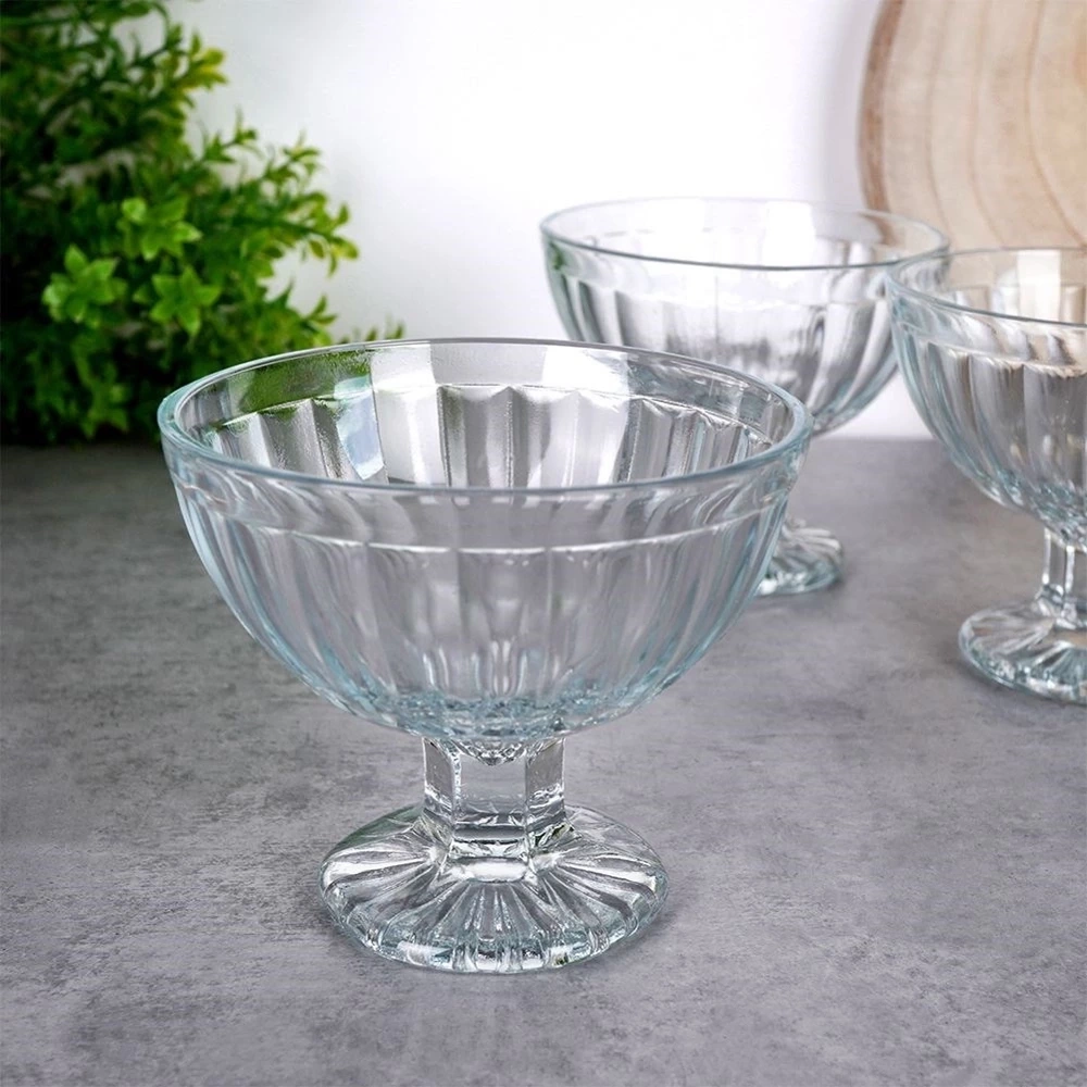 Zestaw trzech pucharków deserowych. Pucharki do lodów są doskonałym rozwiązaniem dla miłośników deserów, pozwalają serwować ulubione desery lub lody w wygodny i elegancki sposób. Wytrzymałe szkło gwarantuje długotrwałe użytkowanie, a łatwość czyszczenia sprawia, że są wygodne w użytkowaniu. Wyprodukowano zgodnie z europejskimi standardami.
