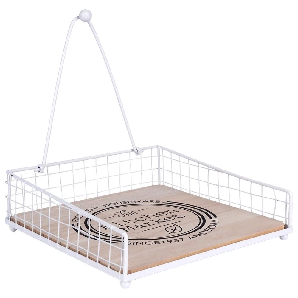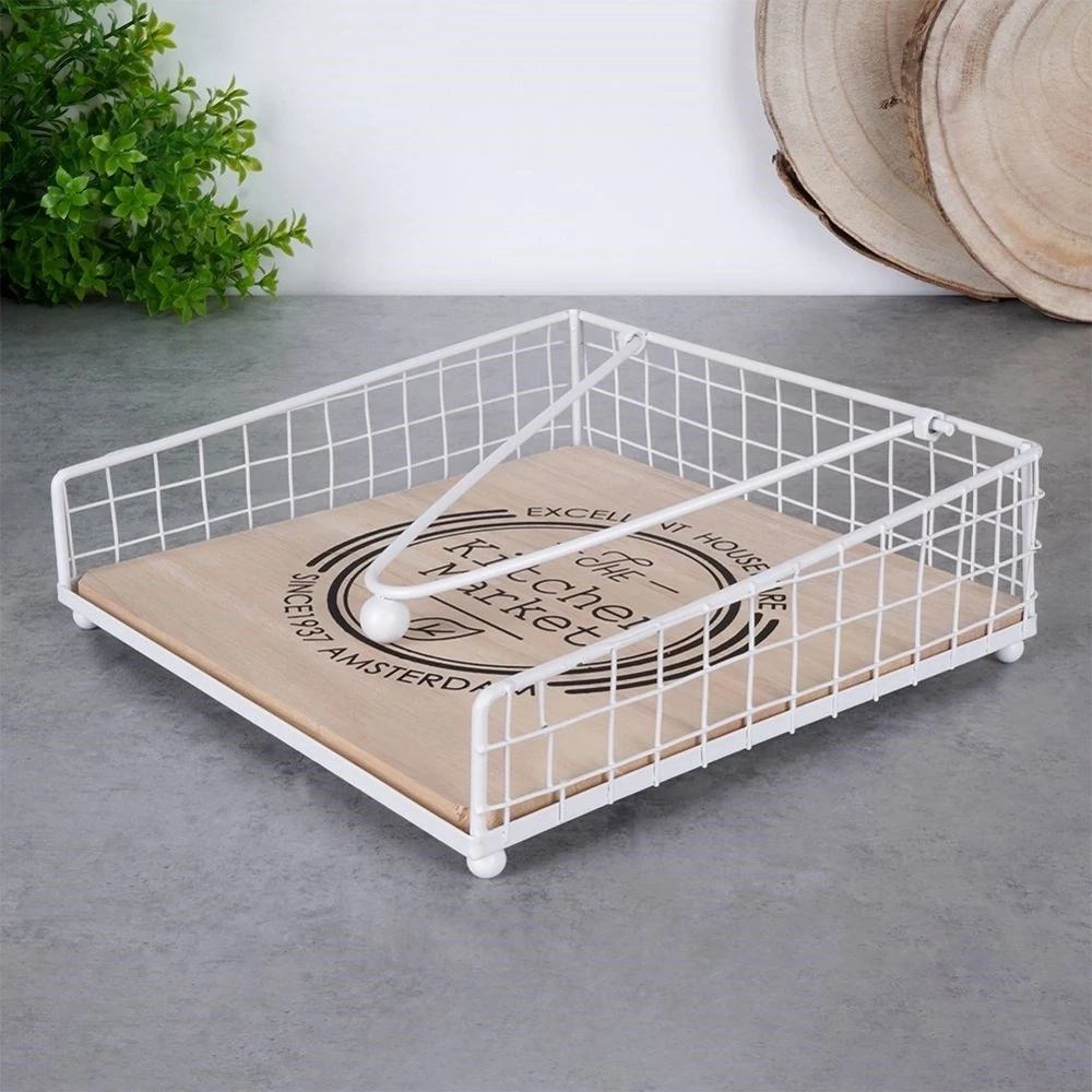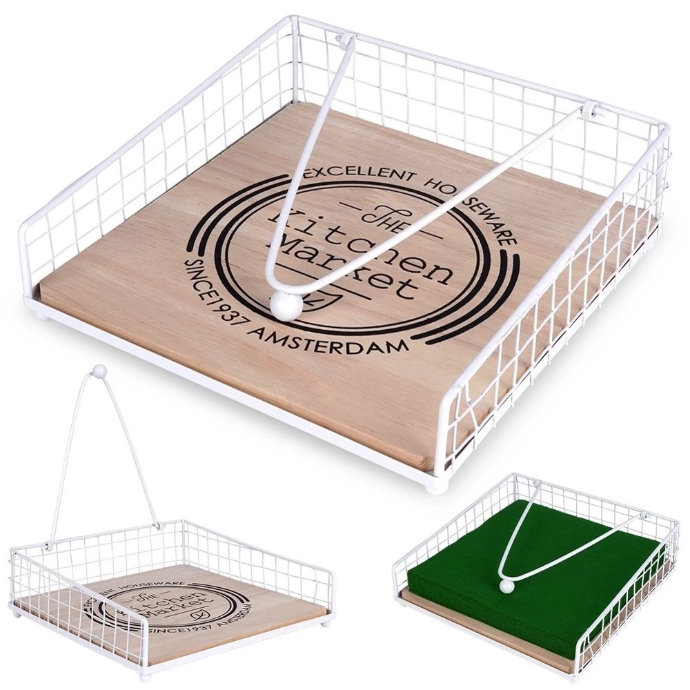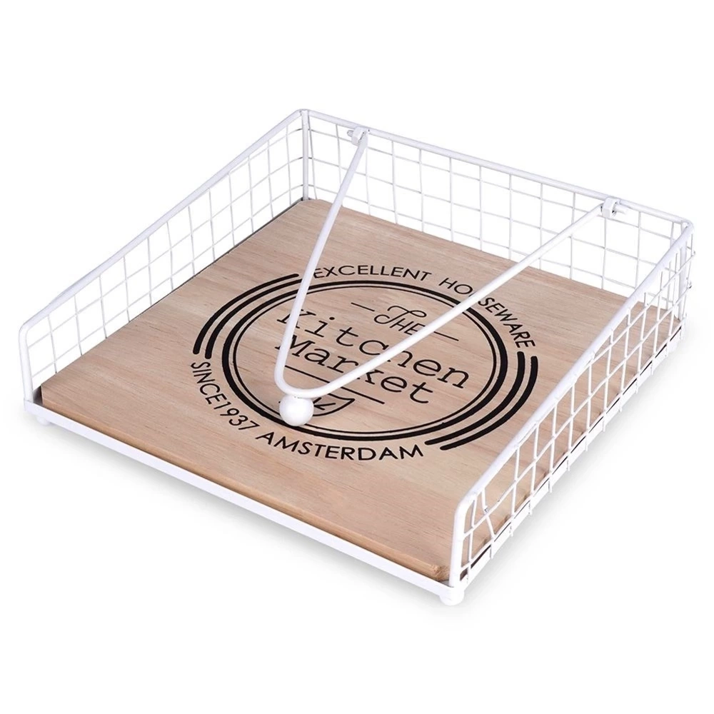 - METALOWY - Serwetnik wykonany z metalu w białym kolorze oraz z drewna dębowego z napisem 'The Kitchen Market'.