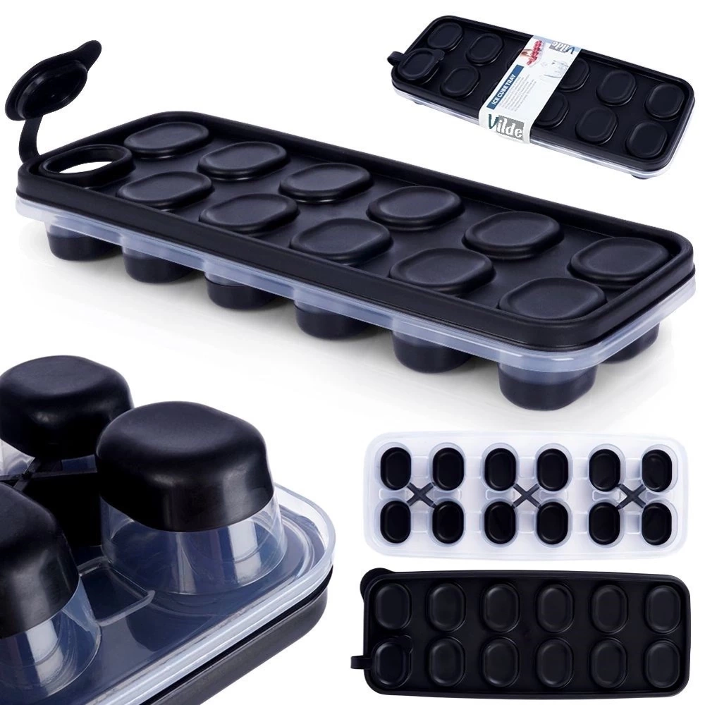 - Forma na 12 kostek lodu z wygodną pokrywką i silikonowym dnem. Pokrywka zapobiegnie wylewaniu wody a silikon ułatwi wyciąganie kostek. Dodatkowo otwór na wlewanie wody.