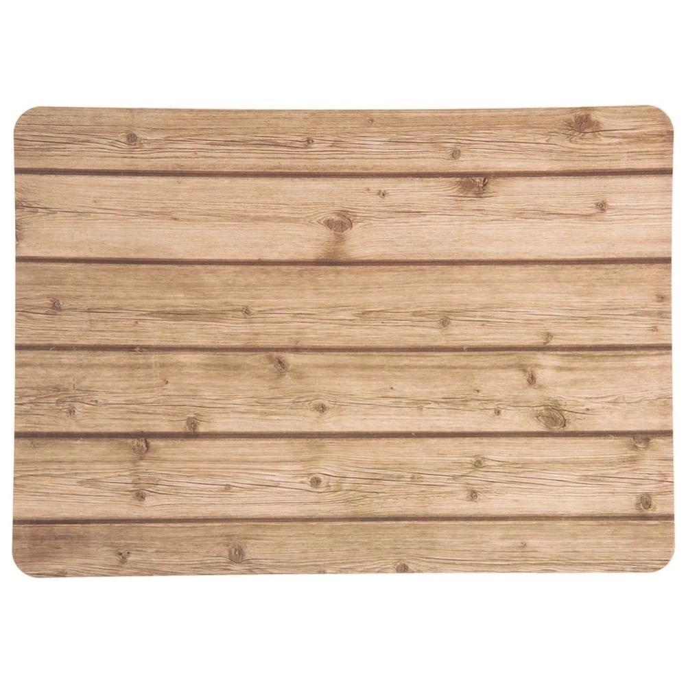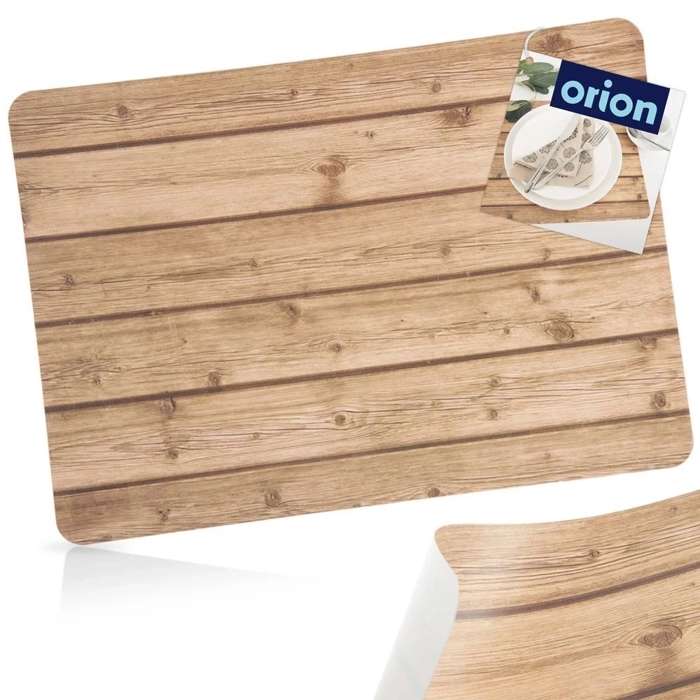 - Prostokątna podkładka kuchenna wykonana z tworzywa z dekorem imitującym drewno. Stanowi piękne tło dla zastawy stołowej i sztućców.