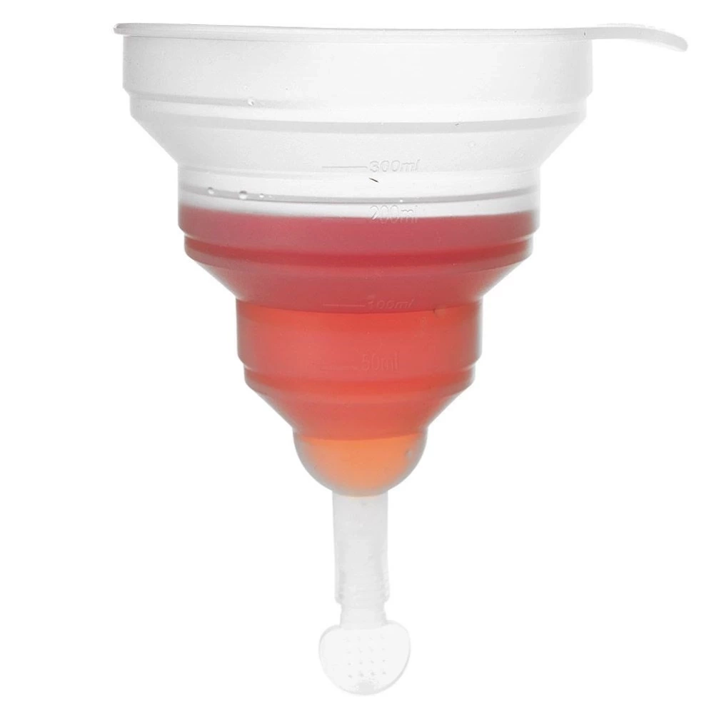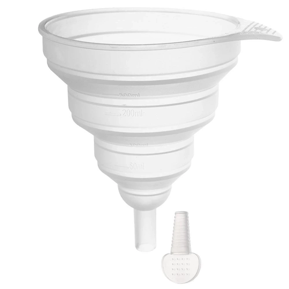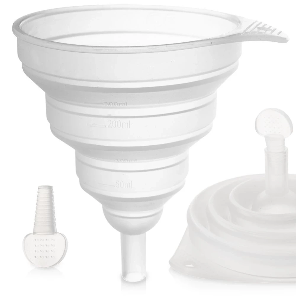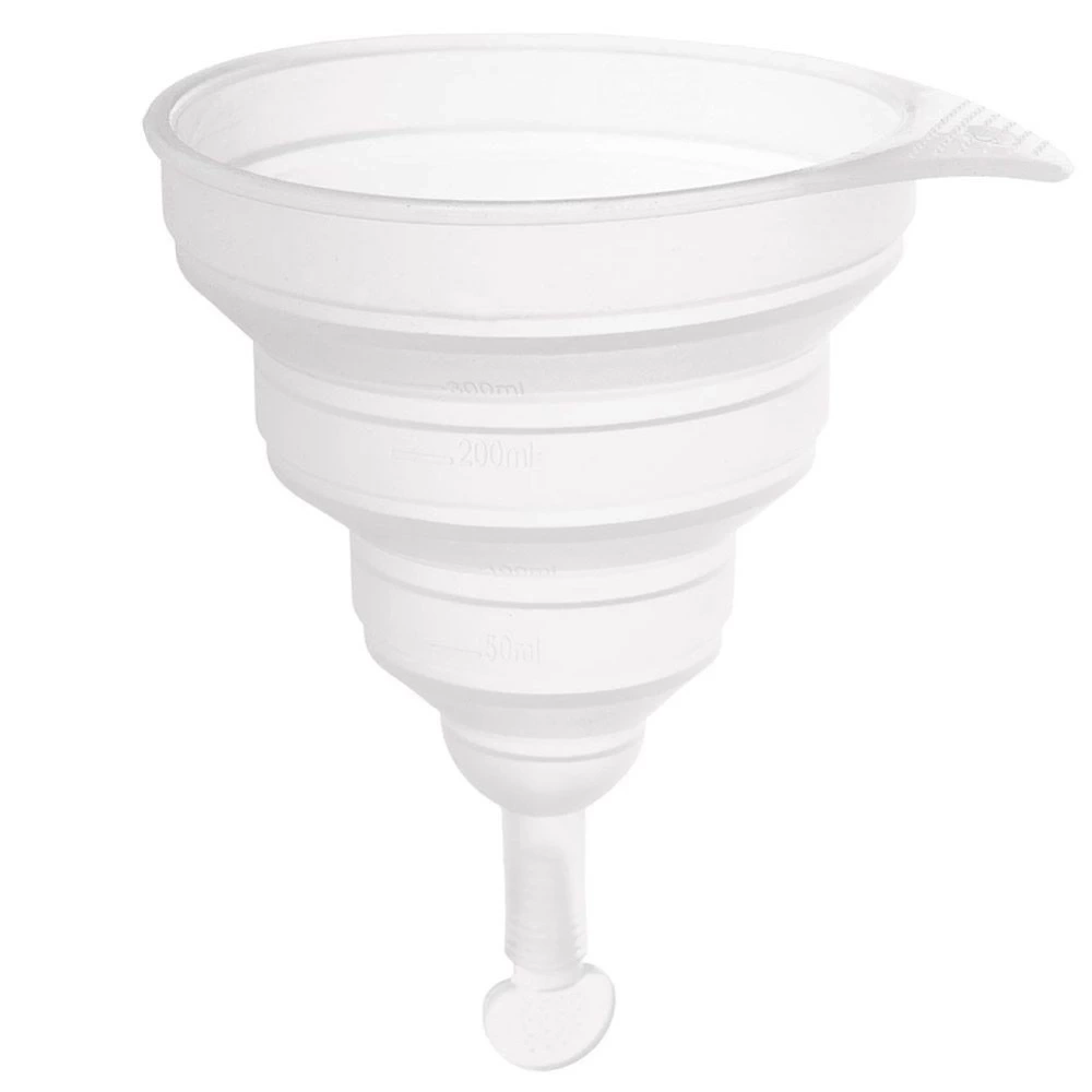 - WYGODNE UŻYTKOWANIE - Lejek jest składany, dzięki czemu zajmuje mało miejsca w szufladzie i jest wygodny do przenoszenia. Można go wygodnie zawiesić na relingu kuchennym. Dodatkowo wyposażony jest w miarkę w skali od 50 ml do 300 ml.