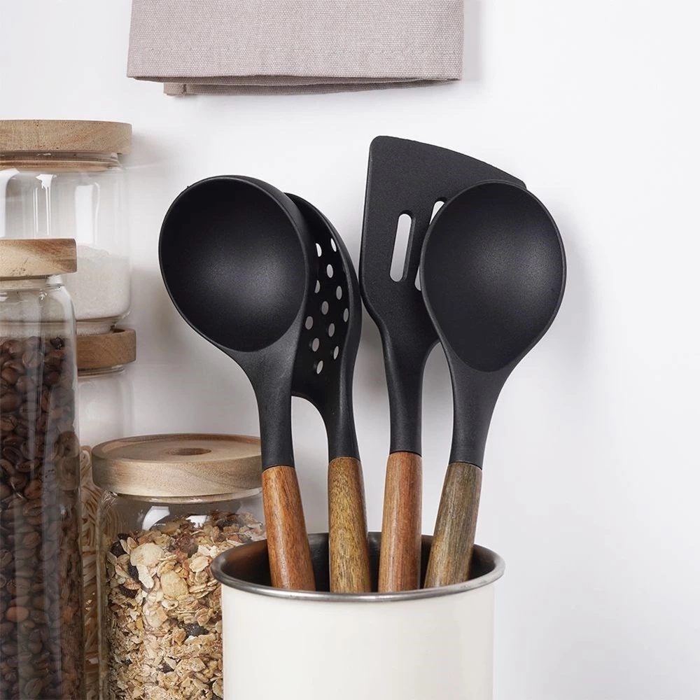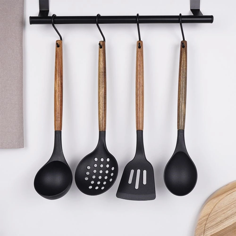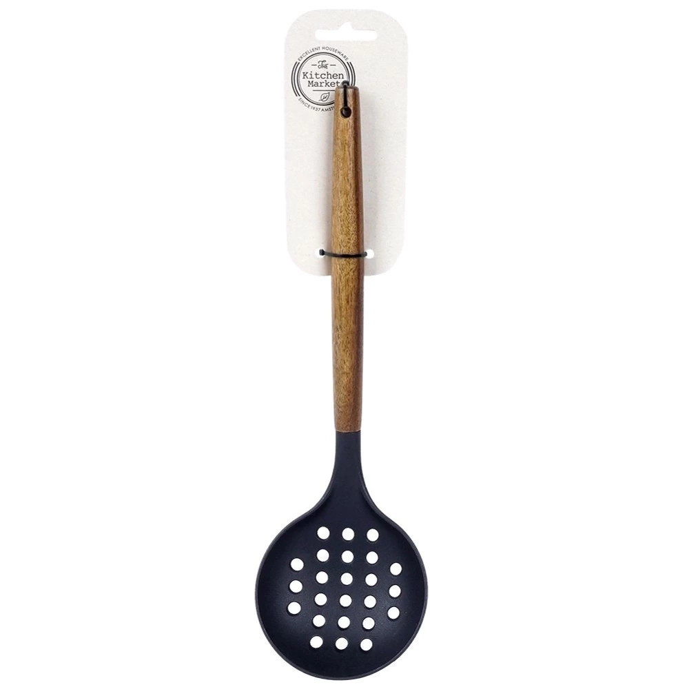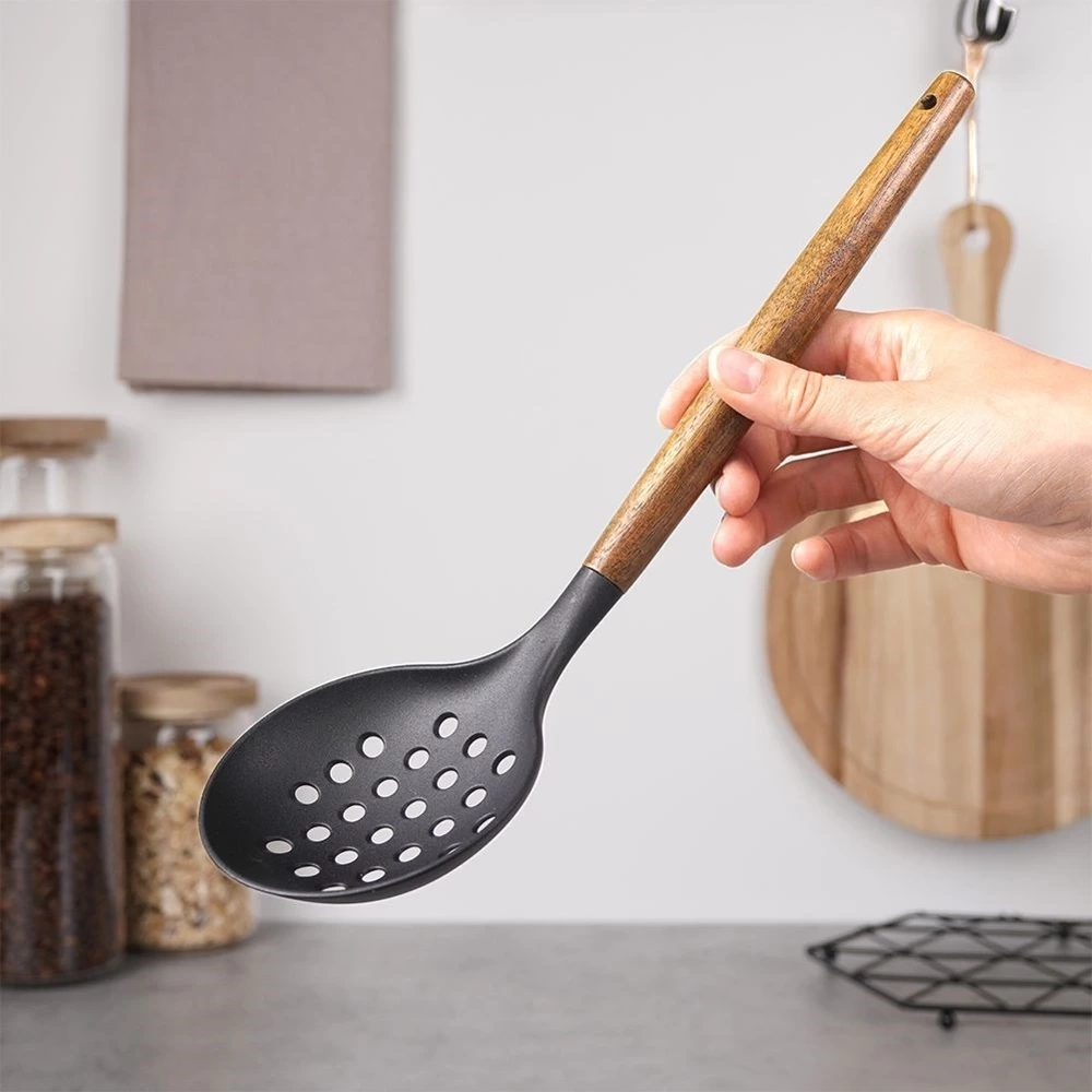 - SOLIDNA - Wykonana z wytrzymałego tworzywa termoplastycznego PBT w czarnym kolorze, a uchwyt wykonany z drewna akacjowego. Odporna na wysokie temperatury do max. 180°C.