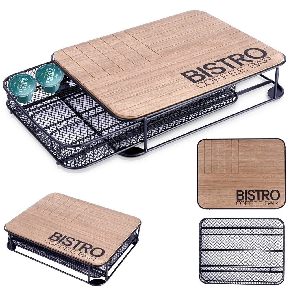 Pojemnik na kapsułki do kawy, wykonany z wytrzymałych materiałów. Dzięki niemu można w wygodny i efektowny sposób przechowywać ulubione kapsułki do ekspresu. Utrzymany w modnym połączeniu czerni z drewnem, dzięki czemu pięknie prezentuje się w kuchni i stanowi jednocześnie element dekoracyjny. Kapsułki w organizatorze można rozłożyć w czterech rzędach, a wysuwana z boku szuflada ułatwia dostęp do nich i ich wyjmowanie. Doskonały pomysł na prezent dla osób korzystających z ekspresu na kapsułki. Wyprodukowano zgodnie z europejskimi standardami.