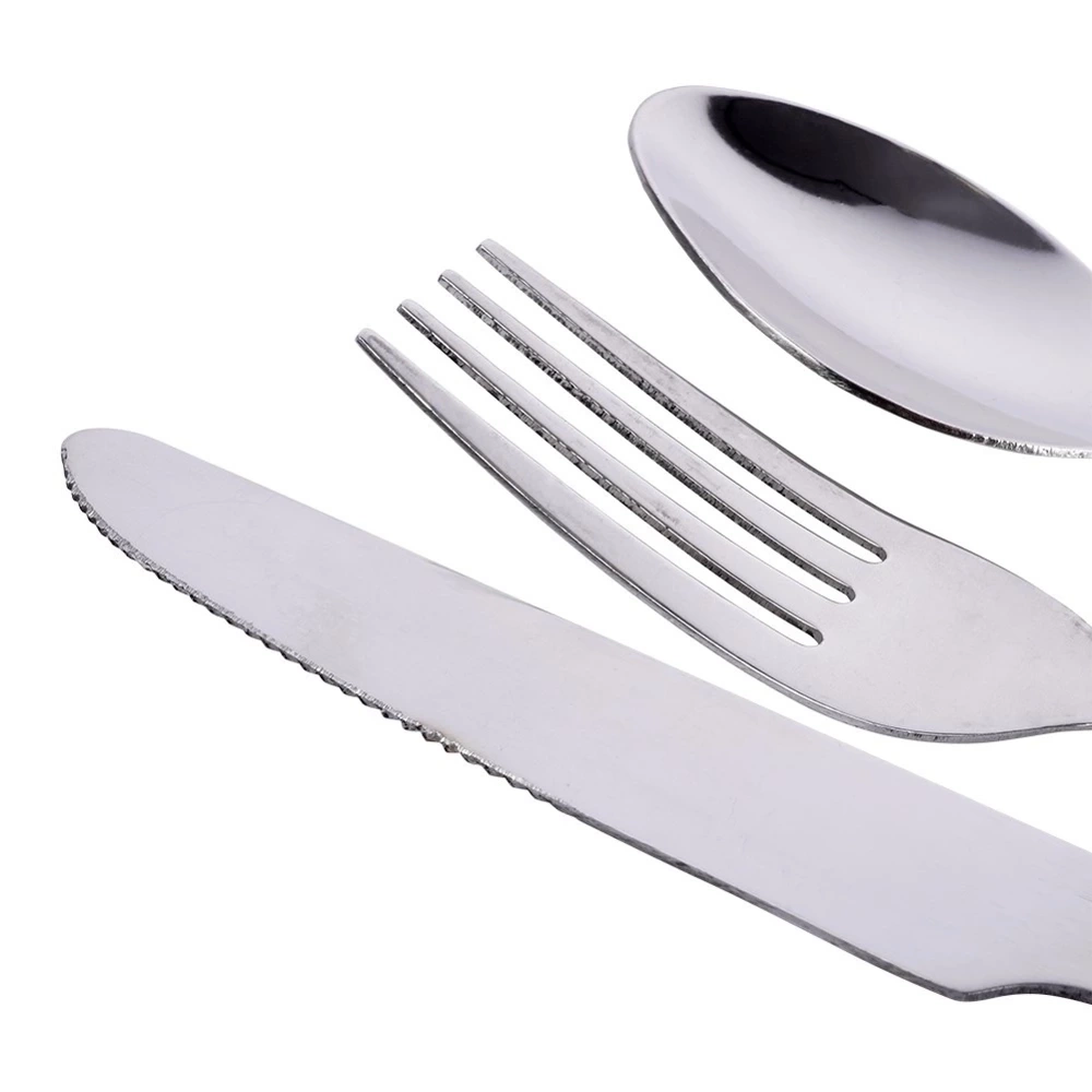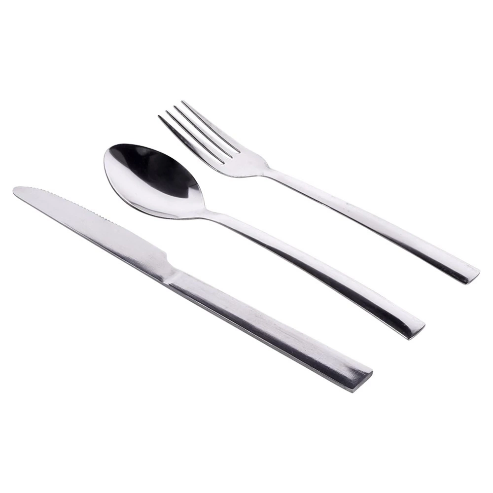 - Zestaw sztućców dla jednej osoby wykonanych ze stali nierdzewnej w błyszczącym, srebrnym kolorze. W zestawie: łyżka, widelec i nóż obiadowy.