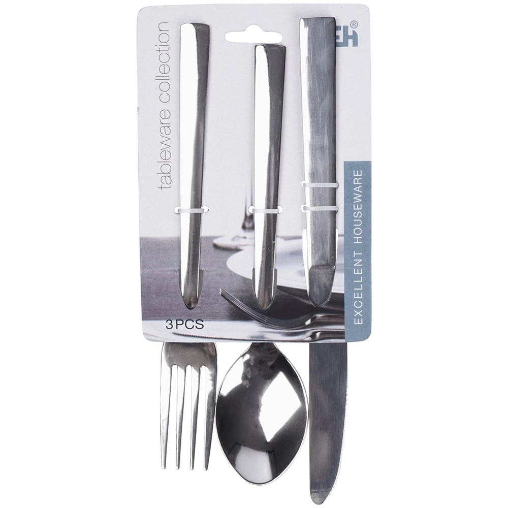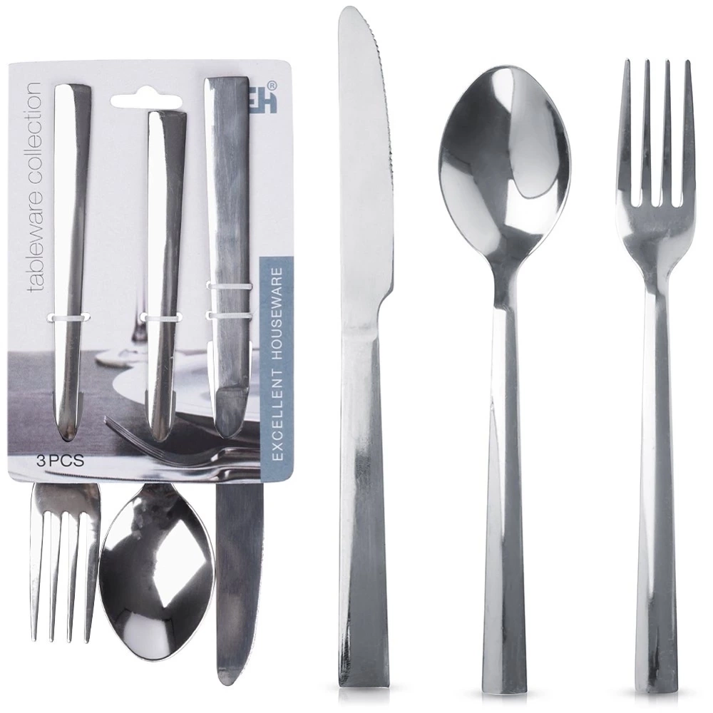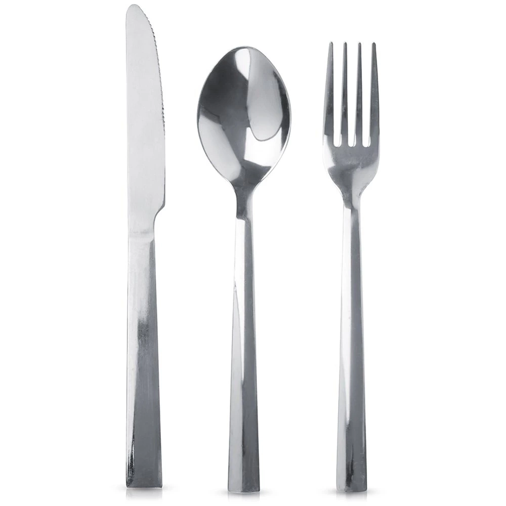 - KLASYCZNE - Zestaw trzech sztućców w srebrnym kolorze dla jednej osoby. W zestawie 3 elementy: 1x łyżka (długość 19,5 cm), 1x widelec (długość 20 cm), 1x nóż (długość 22 cm).