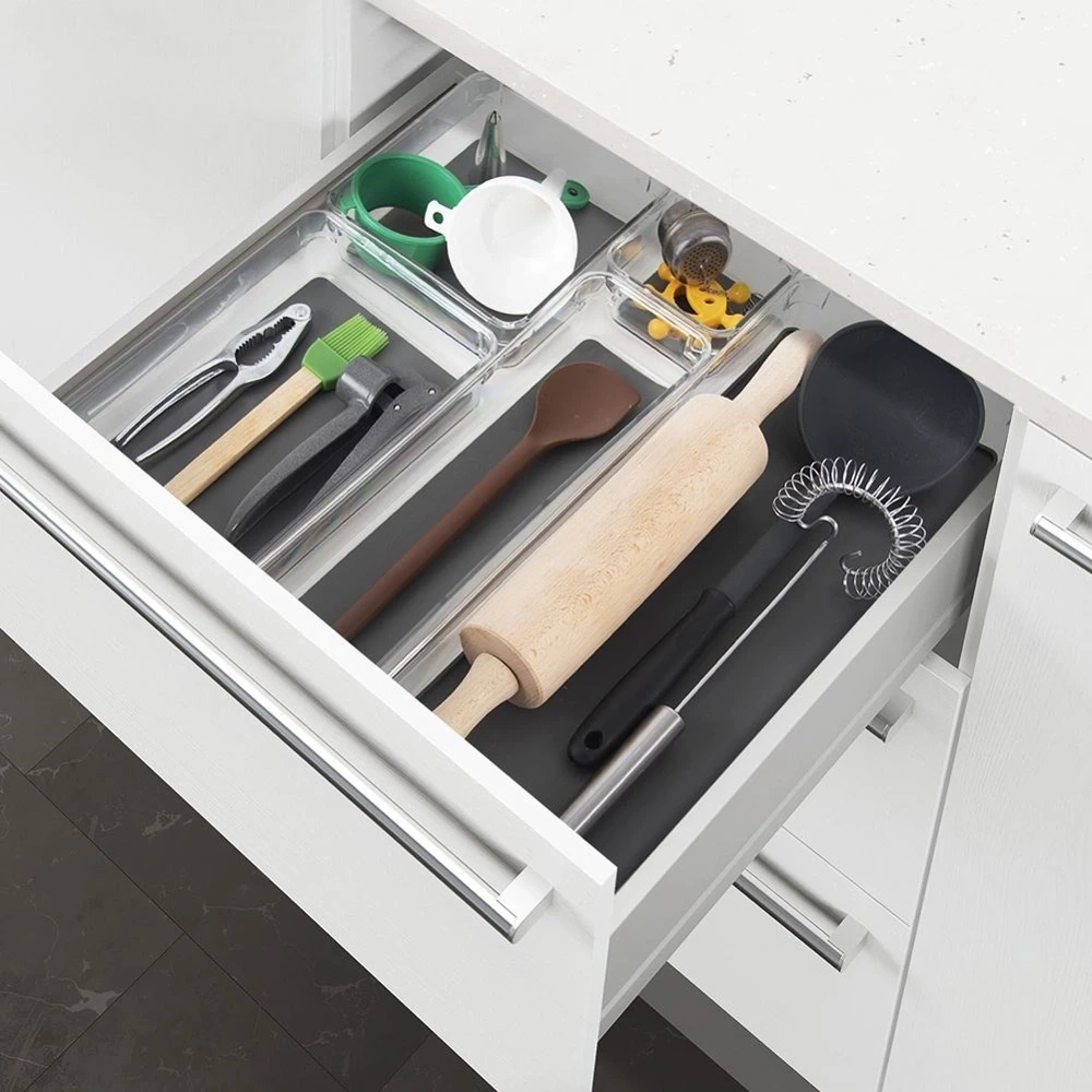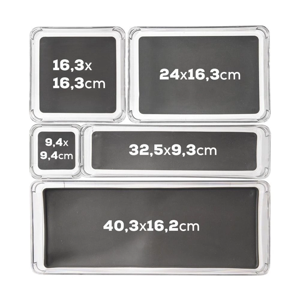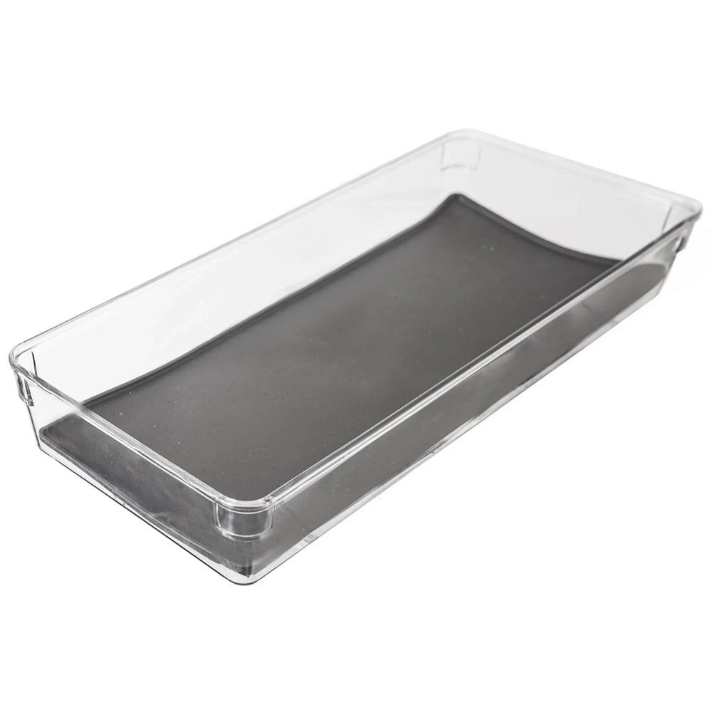 - Pojemnik do przechowywania różnych przedmiotów w szufladzie lub szafce. Wykonany z przezroczystego tworzywa. Posiada antypoślizgowe nóżki oraz gumową matę wewnątrz.