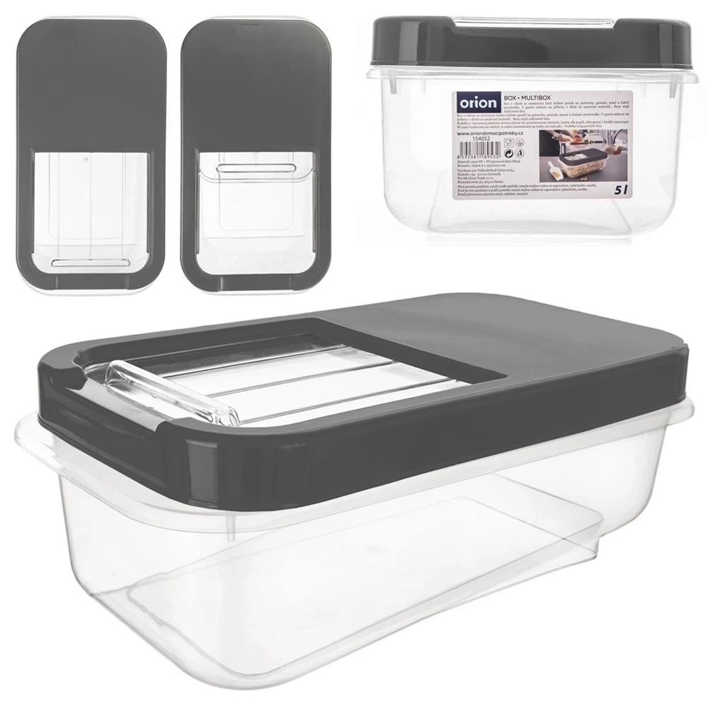 - Uniwersalny pojemnik do przechowywania o pojemności 5 litrów. Posiada pokrywę z częścią przesuwną. Wykonany z wytrzymałego tworzywa. Nadaje się od zmywarki.