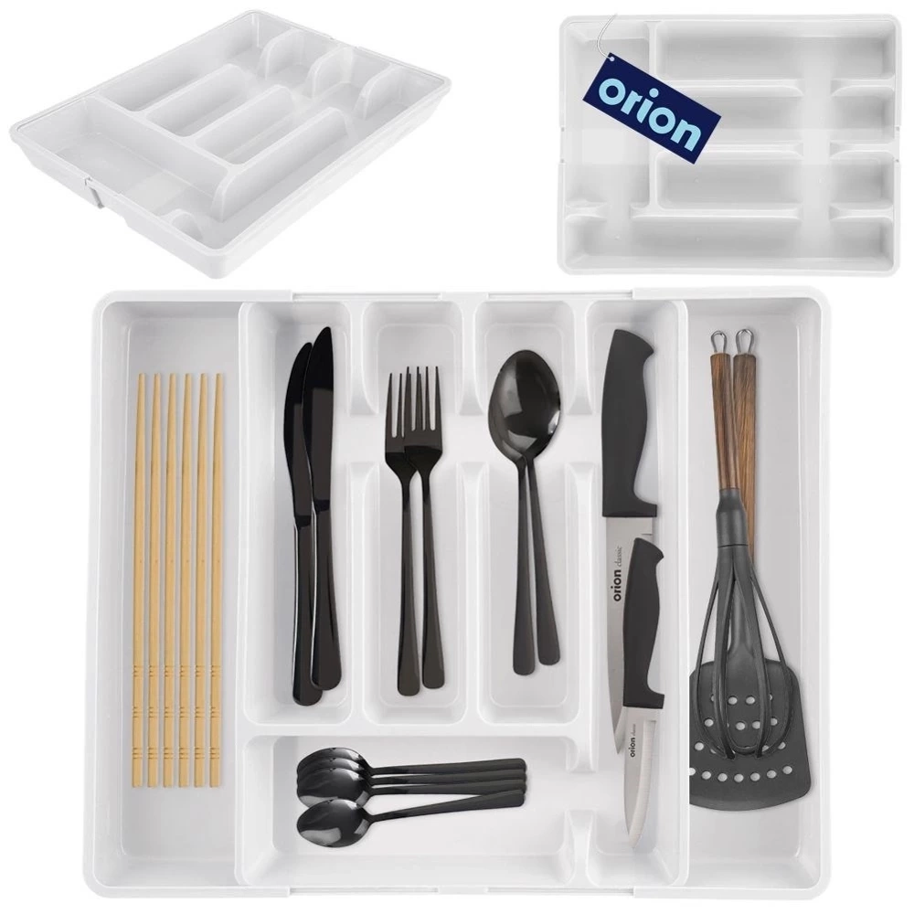 - Regulowany organizer na sztućce oraz przybory kuchenne do szuflady. Wykonany z tworzywa w białym kolorze. W zależności od ustawienia posiada od 5 do 7 przegródek.