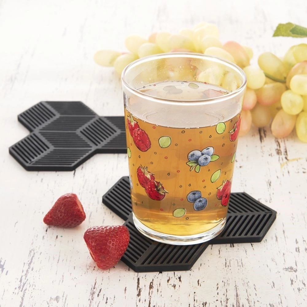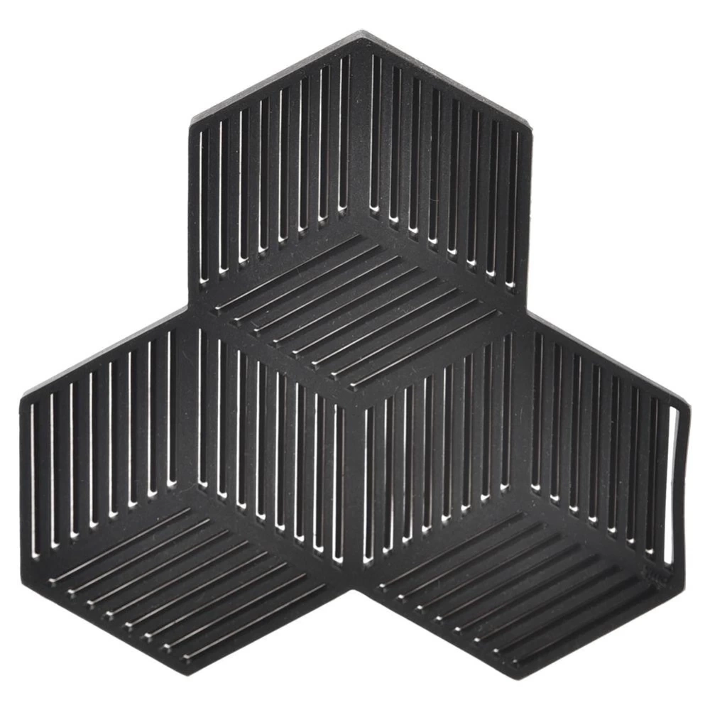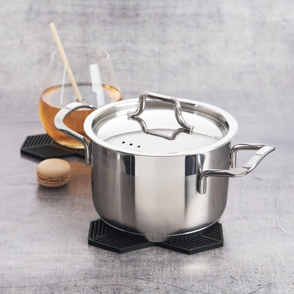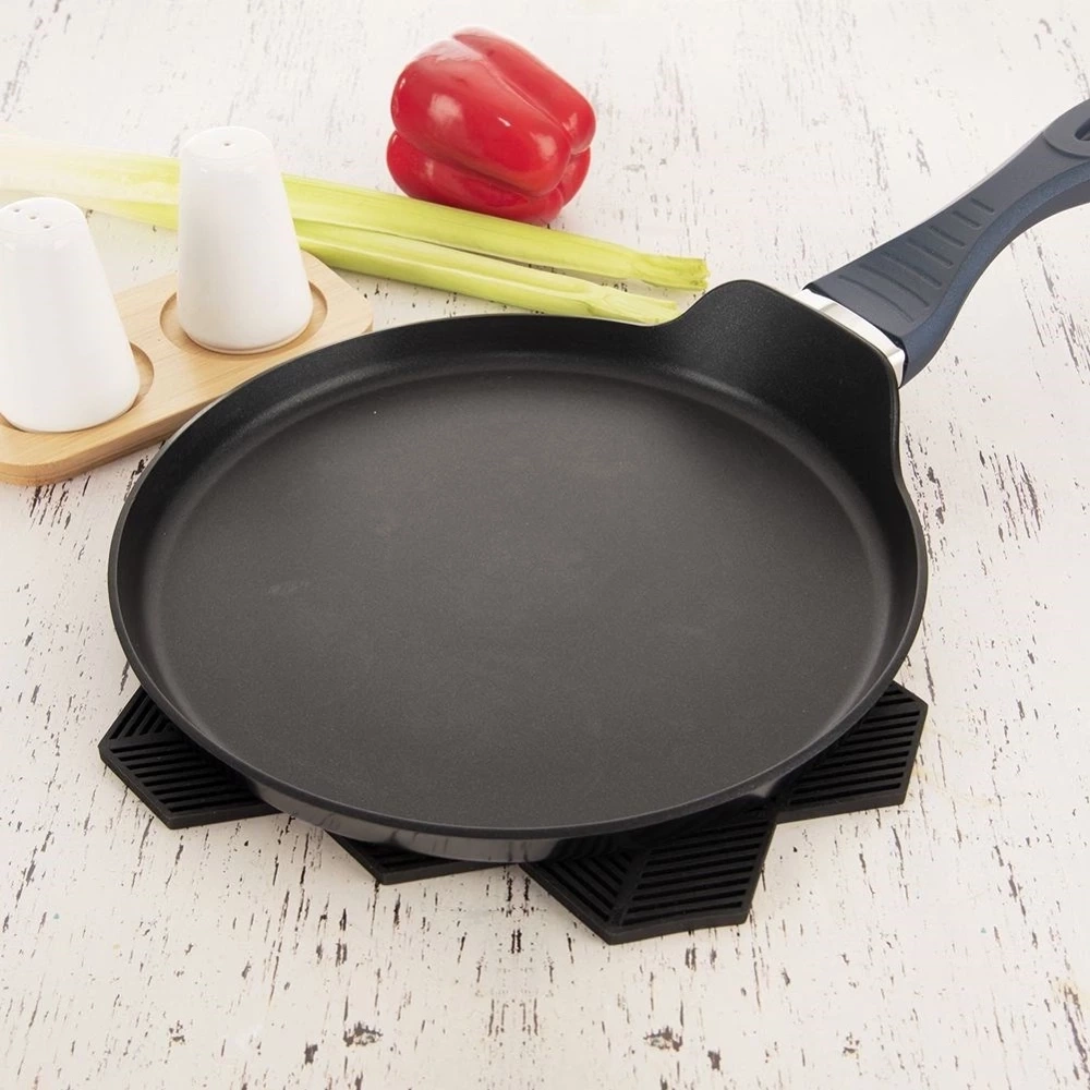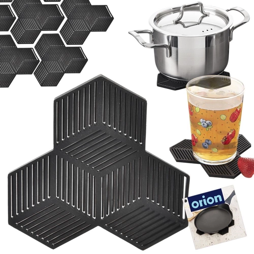 - Podstawka pod gorące naczynia wykonana z silikonu w kolorze czarnym. Dzięki podstawce garnek bezpośrednio po gotowaniu możemy podać na stół. Posiada geometryczny kształt.