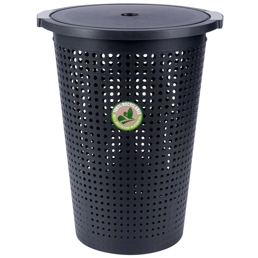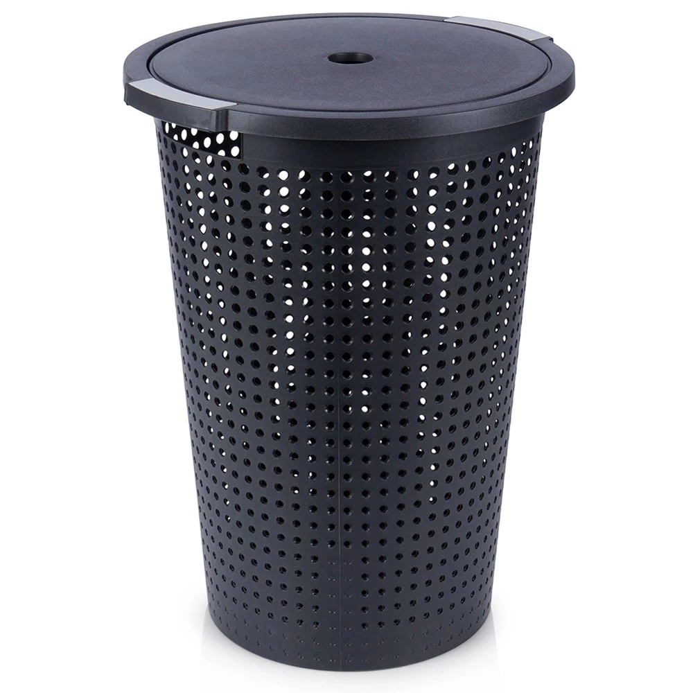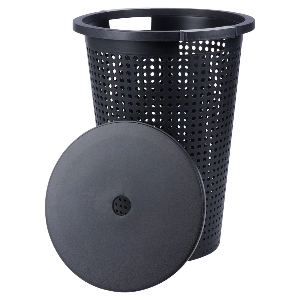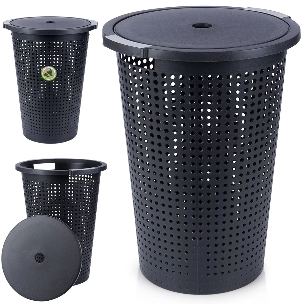 - Perforowany kosz łazienkowy posiadający otwieraną pokrywę. Wykonany z lekkiego i solidnego tworzywa w czarnym kolorze. Przeznaczony do przechowywania odzieży i bielizny do prania.