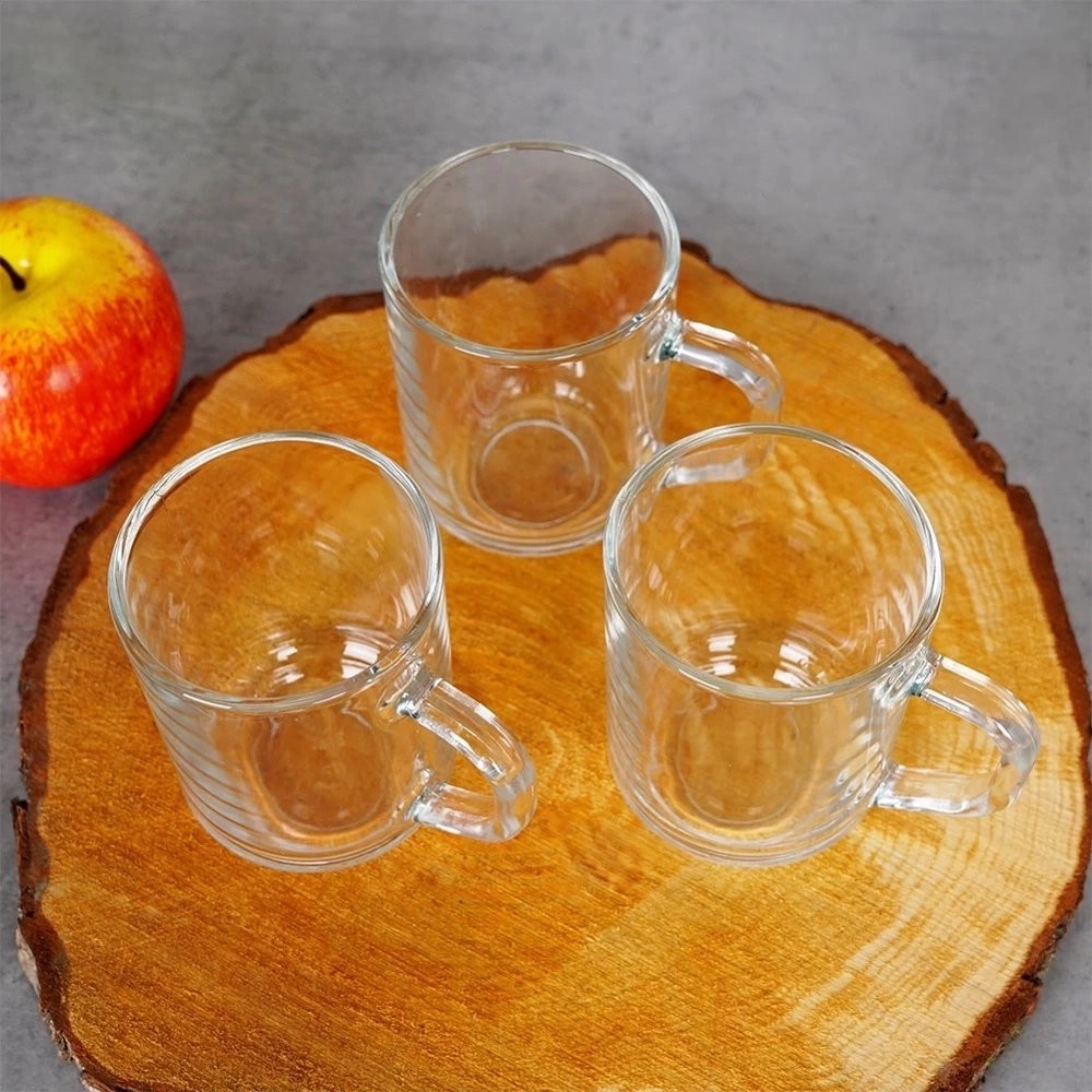 - PRZYDATNE - Zestaw trzech szklanek z uchwytem do kawy, herbaty lub innych napojów. Każda ze szklanek ma pojemność całkowitą 230 ml i wymiary: wysokość 8,5 cm, długość z uchwytem 10 cm, średnica 7 cm.