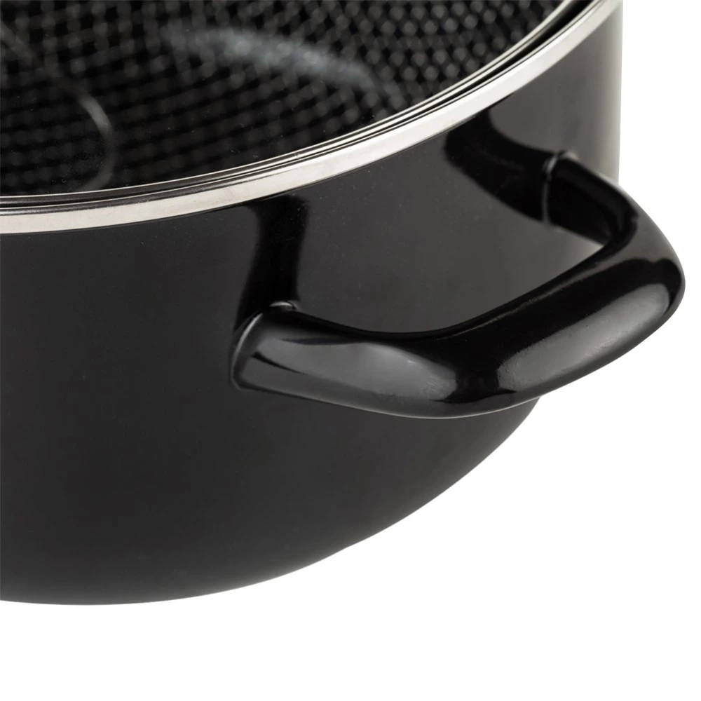 - SOLIDNY - Garnek wykonany z najwyższej jakości stali emaliowanej w czarnym kolorze. Emalia, którą pokryto naczynie jest materiałem przyjaznym dla zdrowia, a nawet bezpiecznym dla alergików. Użyta powłoka nie posiada PFOA i PTFE - Twoje potrawy będą zdrowe i smaczne. Zestaw wyposażony w pokrywkę wykonaną ze szkła oraz sitko ze stali nierdzewnej.