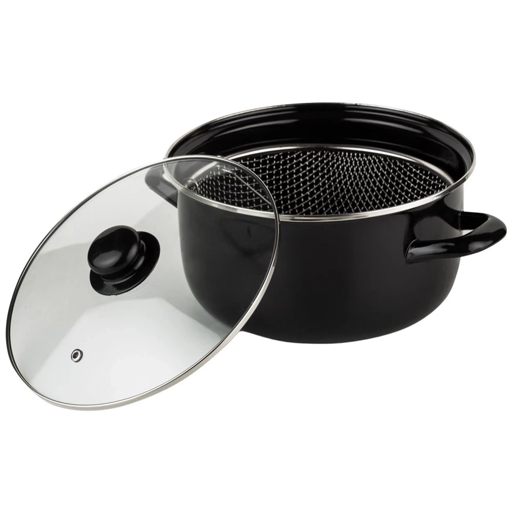 - Emaliowany garnek o pojemności 4 litrów z sitkiem do głębokiego smażenia. Wyposażony w szklaną pokrywkę z otworem. Nadaje się na wszystkie rodzaje kuchenek.