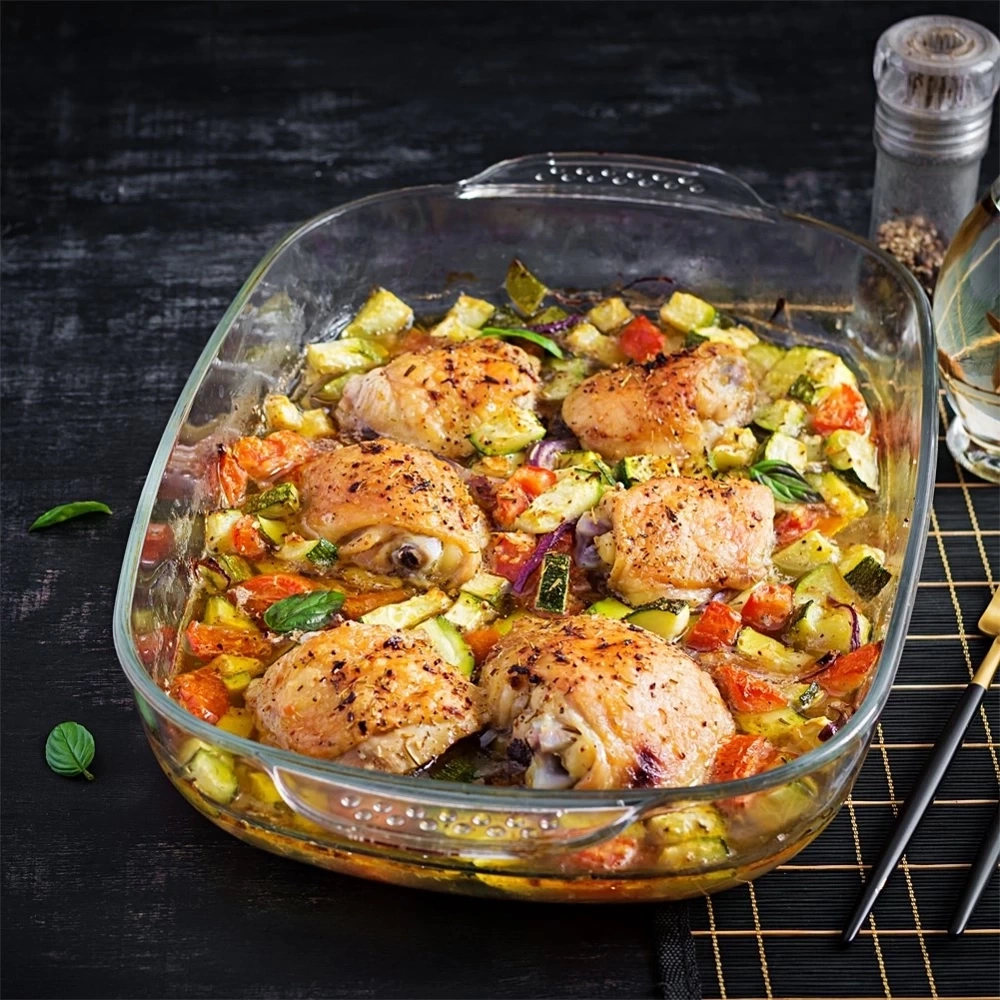 - Żaroodporne naczynie do pieczenia i zapiekania. Wykonane z odpornego na wysoką temperaturę szkła borokrzemowego. Nadaje się do mycia w zmywarce do naczyń.
