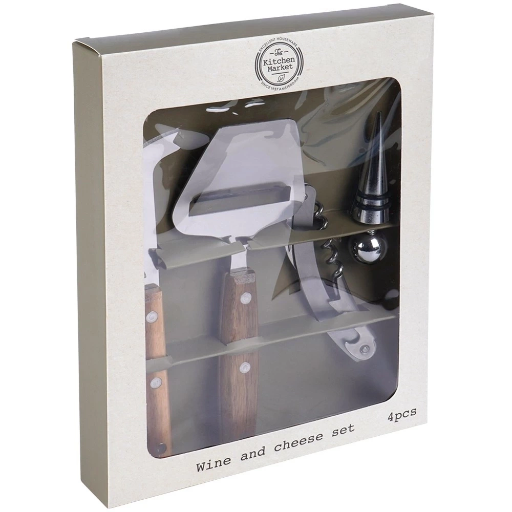 - Zestaw akcesoriów do wina i serów. Zawiera korkociąg, zatyczkę do butelki, nóż do sera oraz łopatkę do sera. Niezwykle funkcjonalny i stylowy. Wykonany ze stali nierdzewnej i drewna.