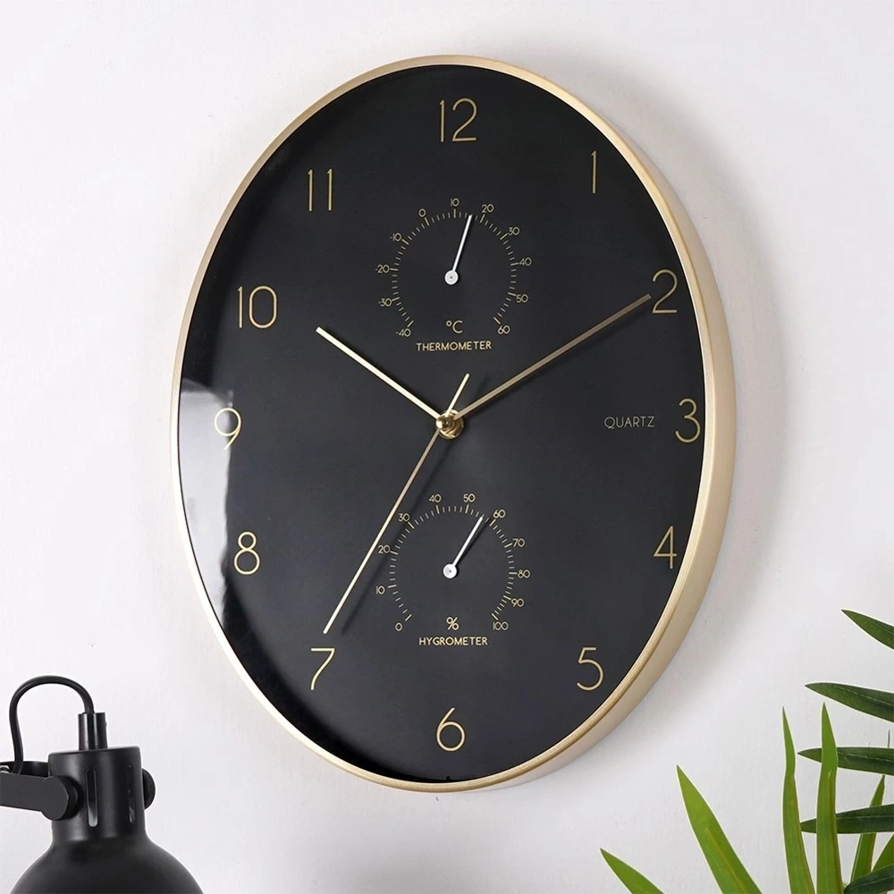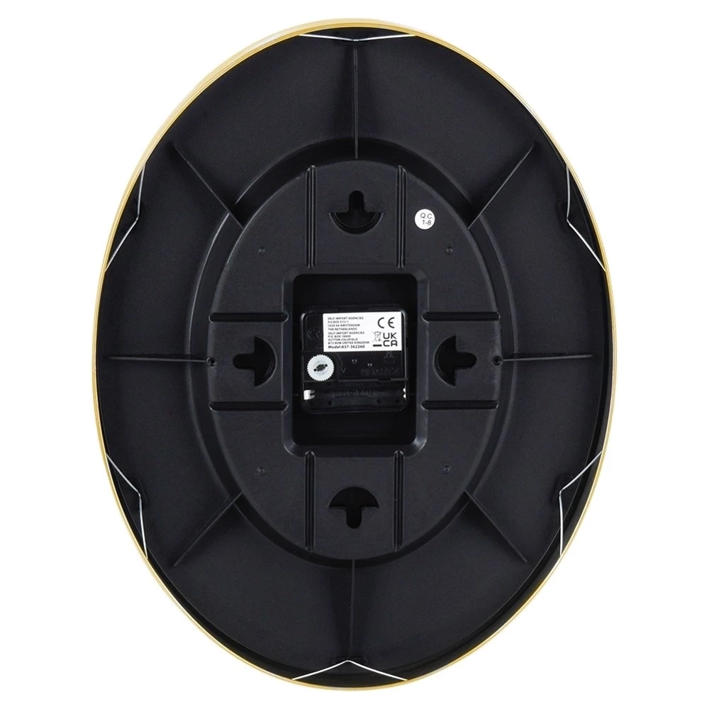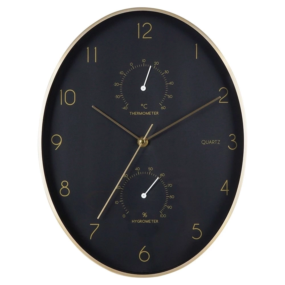 Owalny zegar ścienny z termometrem i higrometrem. Posiada klasyczny design. Pięknie będzie prezentował się w każdym wnętrzu. Zegar może być świetnym pomysłem na prezent np. z okazji parapetówki lub urodzin. Klasyczny styl zegara stanowi dopełnienie każdej aranżacji wnętrza. Utrzymany w modnym połączeniu złota z kolorem czarnym. Z jego pomocą w łatwy sposób odczytamy godzinę, temperaturę powietrza oraz wilgotność. Wyprodukowano zgodnie z europejskimi standardami.