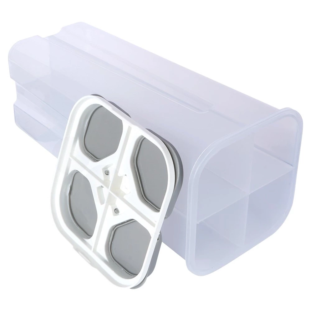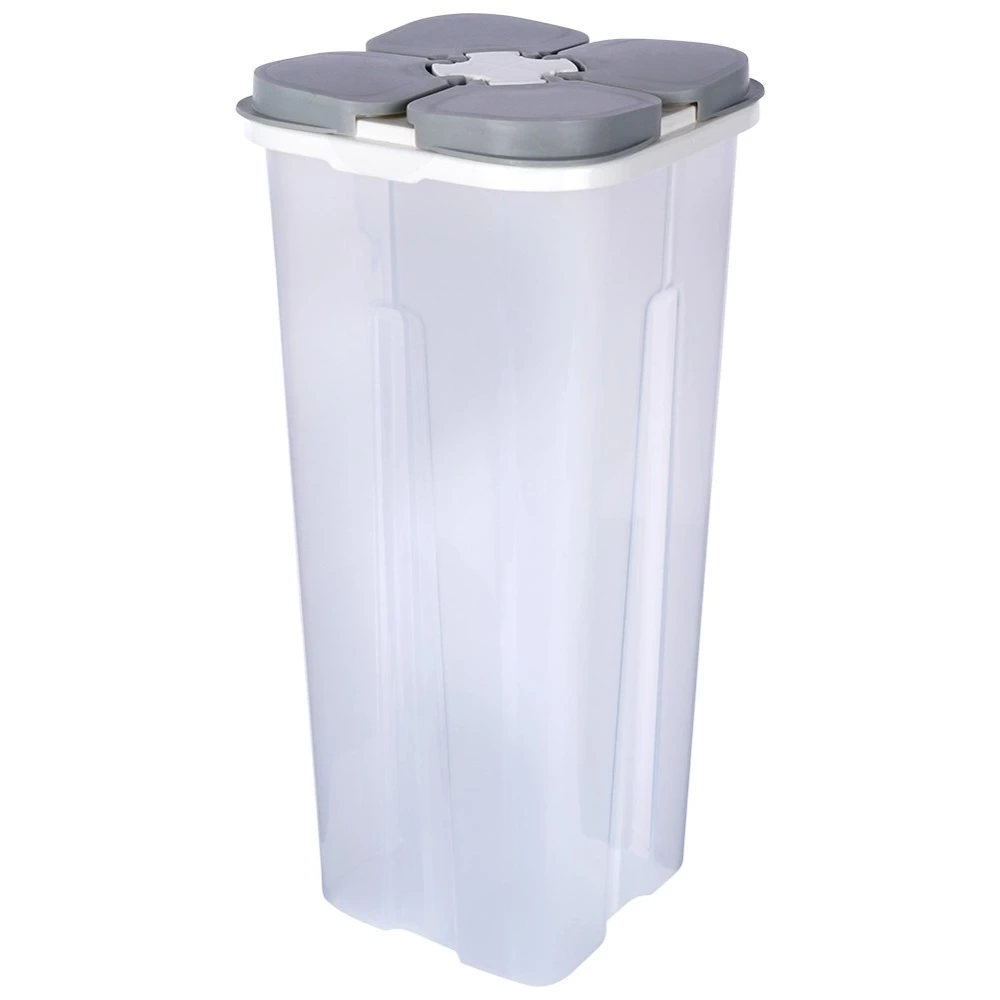 - Pojemnik do przechowywania sypkich produktów. Posiada cztery niezależne przegródki z osobnym zamknięciem dozującym. Ułatwi zachowanie porządku w kuchni.