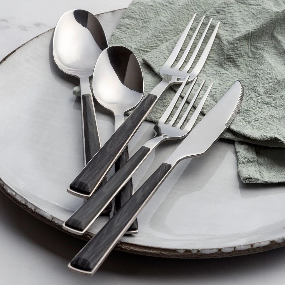 - Widelczyk deserowy o długości 18 cm. Wykonany ze stali nierdzewnej w srebrnym kolorze, posiada uchwyt imitujący drewno w czarnym kolorze. Nadaje się do mycia w zmywarce.